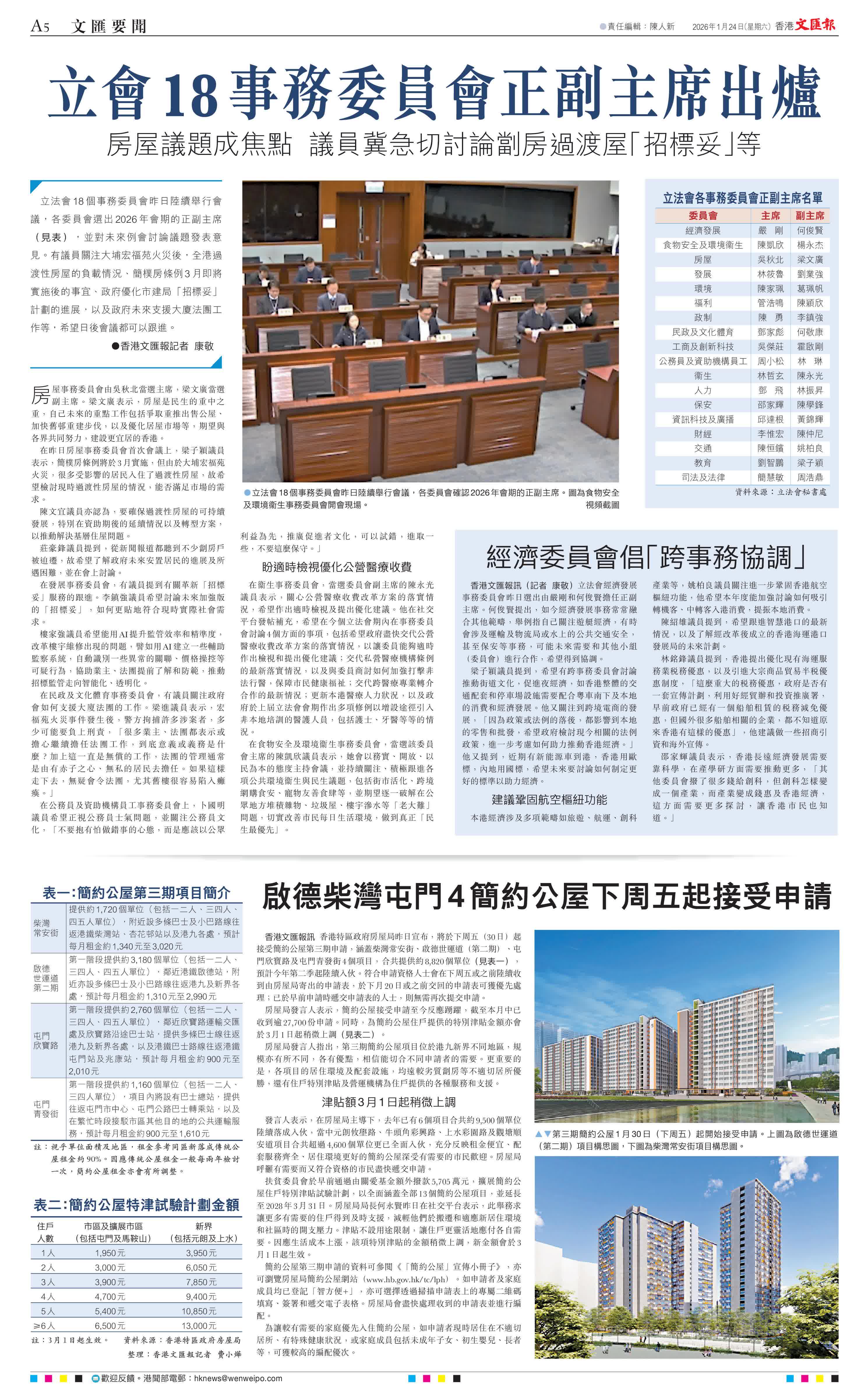 (香港文匯報記者 康敬)立法會18個事務委員會昨日陸續舉行會議,各委員會選出2026年會期的正副主席,並對未來例會討論議題發表意見。有議員關注大埔宏福苑火災後,全港過渡性房屋的負載情況、簡樸房條例3月即將實施後的事宜、政府優化市建局「招標妥」計劃的進展,以及政府未來支援大廈法團工作等,希望日後會議都可以跟進。