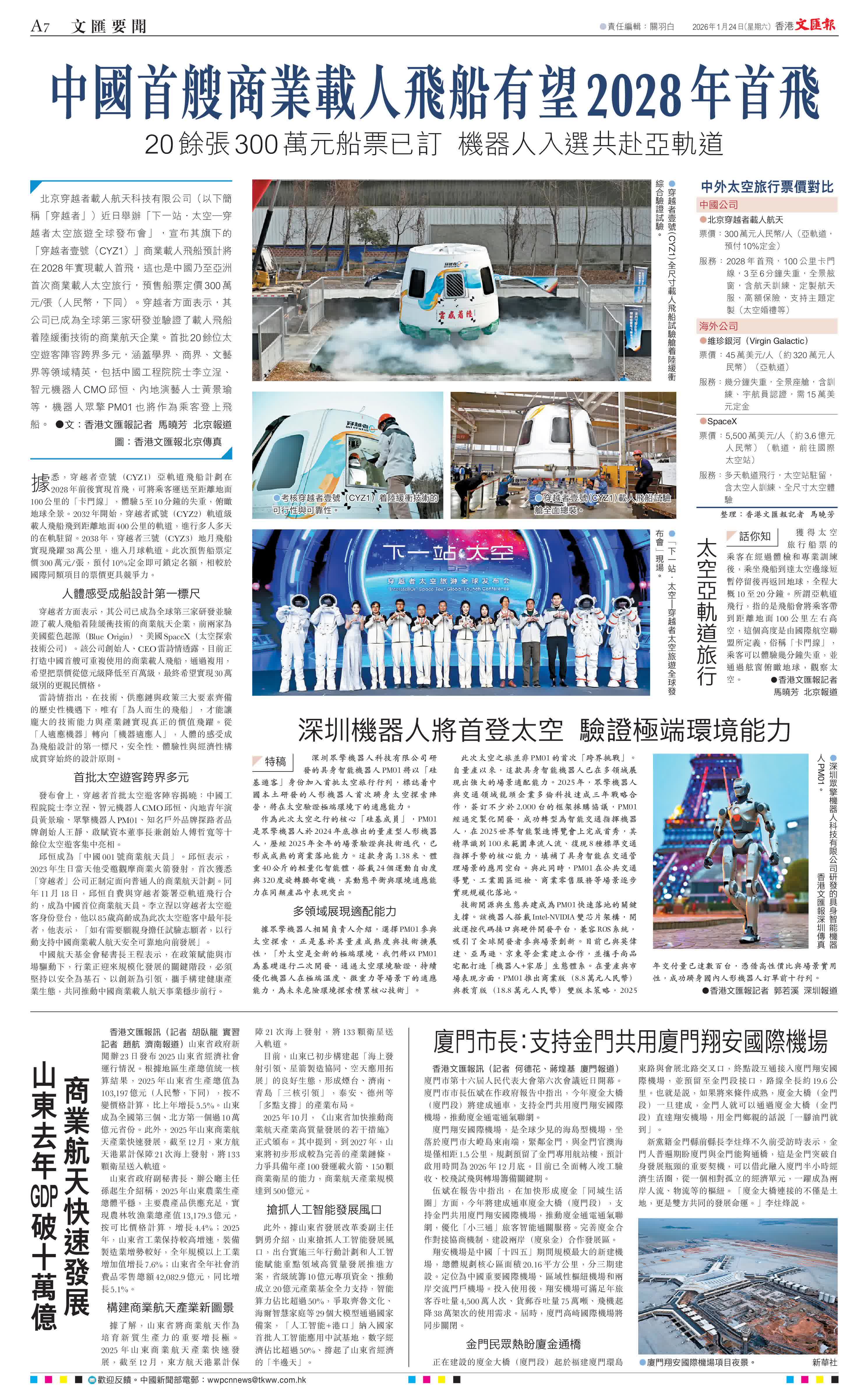 (香港文匯報記者馬曉芳 北京報道)北京穿越者載人航天科技有限公司(以下簡稱「穿越者」)近日舉辦「下一站·太空—穿越者太空旅遊全球發布會」,宣布其旗下的「穿越者壹號(CYZ1)」商業載人飛船預計將在2028年實現載人首飛,這也是中國乃至亞洲首次商業載人太空旅行,預售船票定價300萬元/張(人民幣,下同)。穿越者方面表示,其公司已成為全球第三家研發並驗證了載人飛船着陸緩衝技術的商業航天企業。首批20餘位太空遊客陣容跨界多元,涵蓋學界、商界、文藝界等領域精英,包括中國工程院院士李立浧、智元機器人CMO邱恒、內地演藝人士黃景瑜等,機器人眾擎PM01也將作為乘客登上飛船。