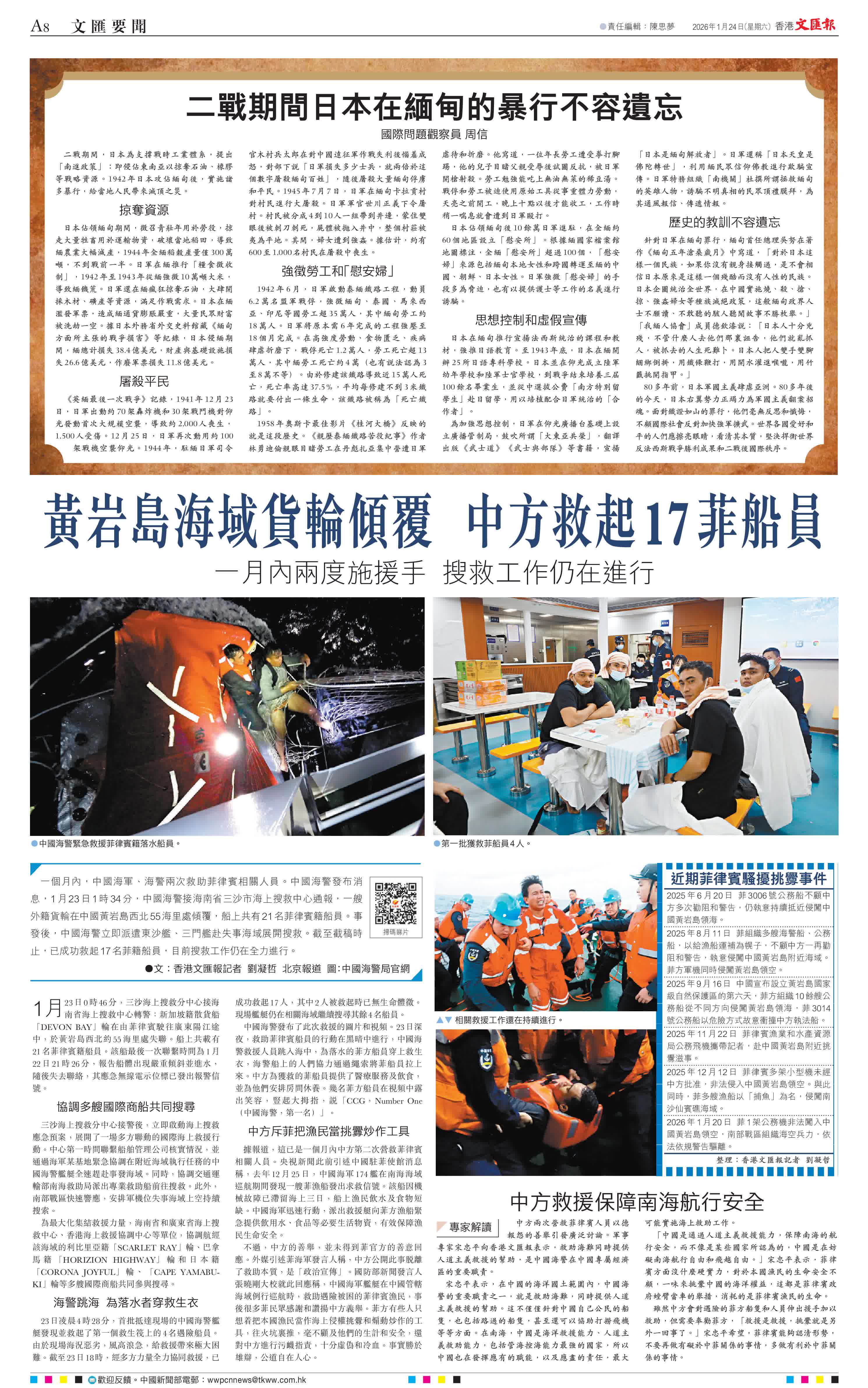 (香港文匯報記者劉凝哲 北京報道)一個月內,中國海軍、海警兩次救助菲律賓相關人員。中國海警發布消息,1月23日1時34分,中國海警接海南省三沙市海上搜救中心通報,一艘外籍貨輪在中國黃岩島西北55海里處傾覆,船上共有21名菲律賓籍船員。事發後,中國海警立即派遣東沙艦、三門艦赴失事海域展開搜救。截至截稿時止,已成功救起17名菲籍船員,目前搜救工作仍在全力進行。