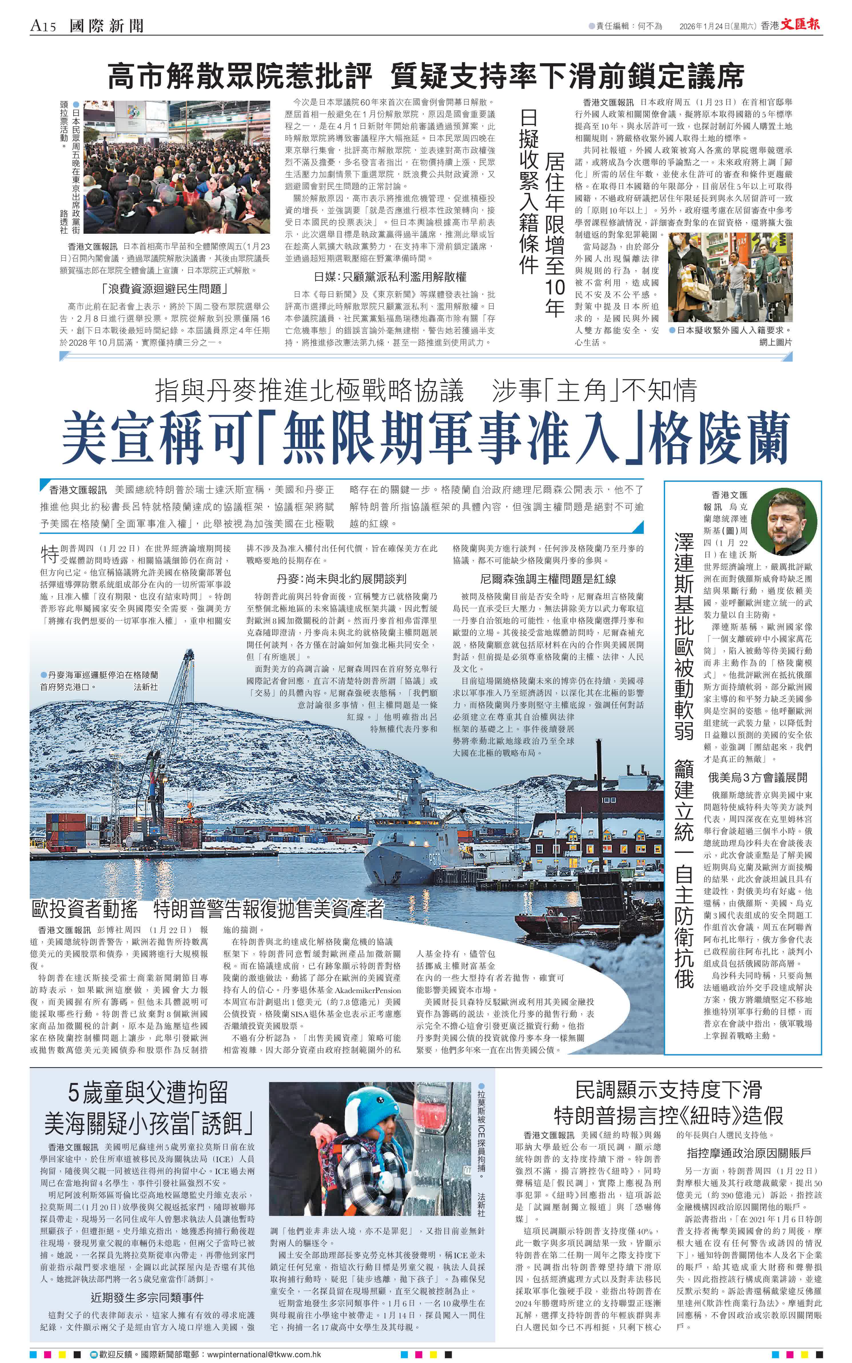 香港文匯報訊 美國總統特朗普於瑞士達沃斯宣稱,美國和丹麥正推進他與北約秘書長呂特就格陵蘭達成的協議框架,協議框架將賦予美國在格陵蘭「全面軍事准入權」,此舉被視為加強美國在北極戰略存在的關鍵一步。格陵蘭自治政府總理尼爾森公開表示,他不了解特朗普所指協議框架的具體內容,但強調主權問題是絕對不可逾越的紅線。