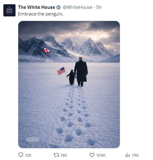據央視新聞報道,當地時間1月23日,美國白宮在社交媒體發布了一張AI圖片。圖片中美國總統特朗普和手持美國國旗的企鵝行走在冰天雪地中,他們的前方插着丹麥自治領地格陵蘭島旗,並配文「擁抱企鵝」。