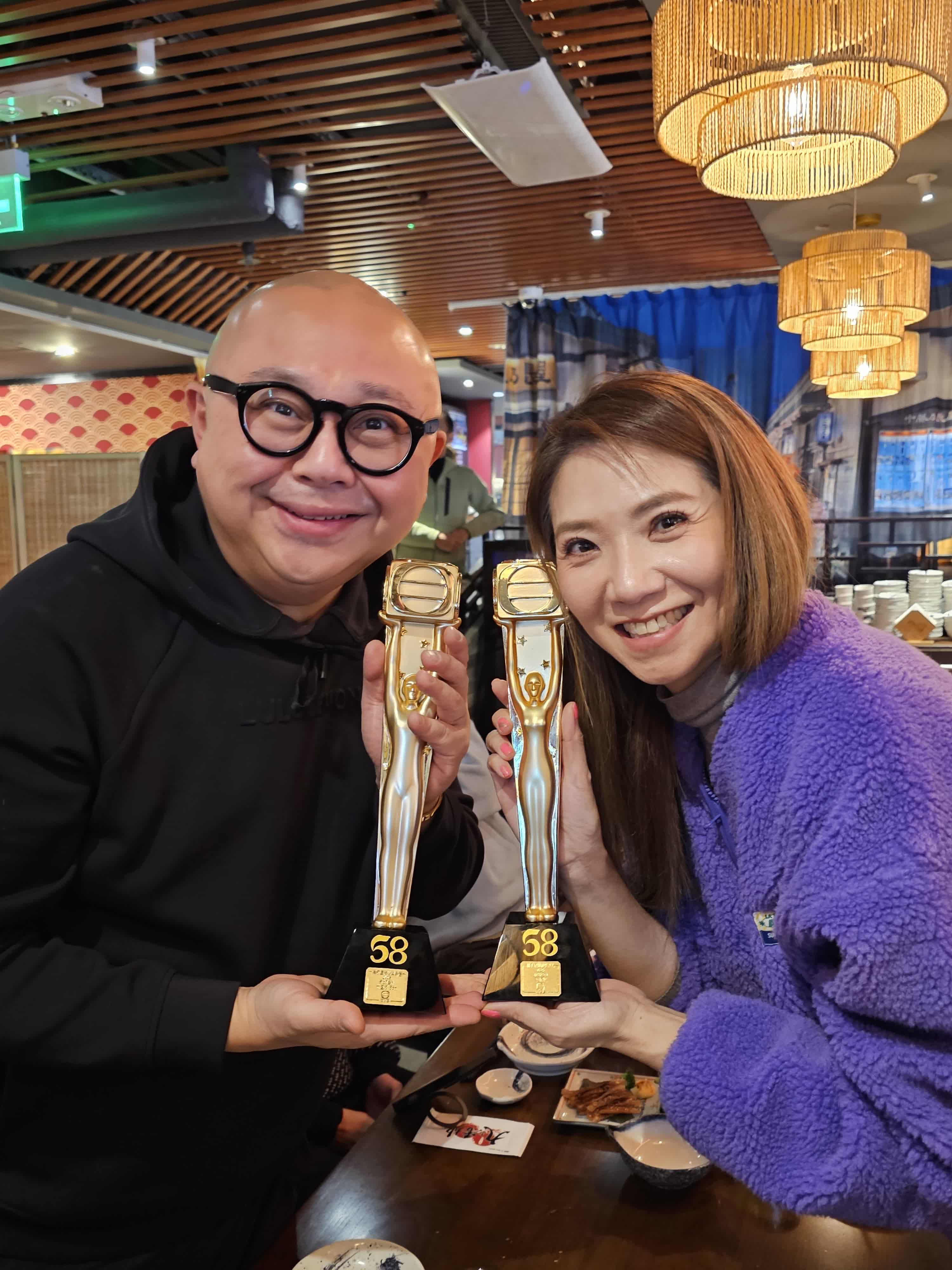 香港文匯報訊(記者 子棠)林盛斌(Bob)和車婉婉在《萬千星輝頒獎典禮2025》中奪得「最佳男、女主持」獎,兩住最佳主持得主願望成真,昨晚齊於日本餐廳包下廂房,慰勞《中年好聲音》、《女神配對計劃》及《攻你上大學》全體幕後,相當有心。據知二人於等候頒獎禮結果期間,因互相睇好對方,故約定若齊齊攞獎一定要夾份宴請三個團隊的所有幕後予以慰勞,果然言出必行「找數」!