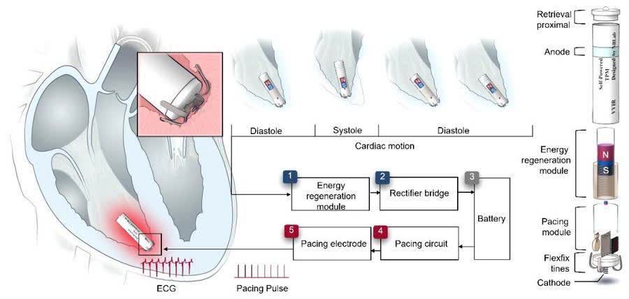 這款起搏器的核心創新是集成了高效能量再生模塊:它能通過電磁感應技術,從心臟自身的跳動中捕獲動能,並將其轉化為電能。測試顯示,其輸出功率已突破起搏器終身運行的臨界能量閾值,可穩定驅動起搏電路,實現對心臟節律的精準調控。同時,器件採用高度微型化設計,兼具優異的生物相容性與血液相容性,支持經導管微創植入,大幅降低手術創傷。