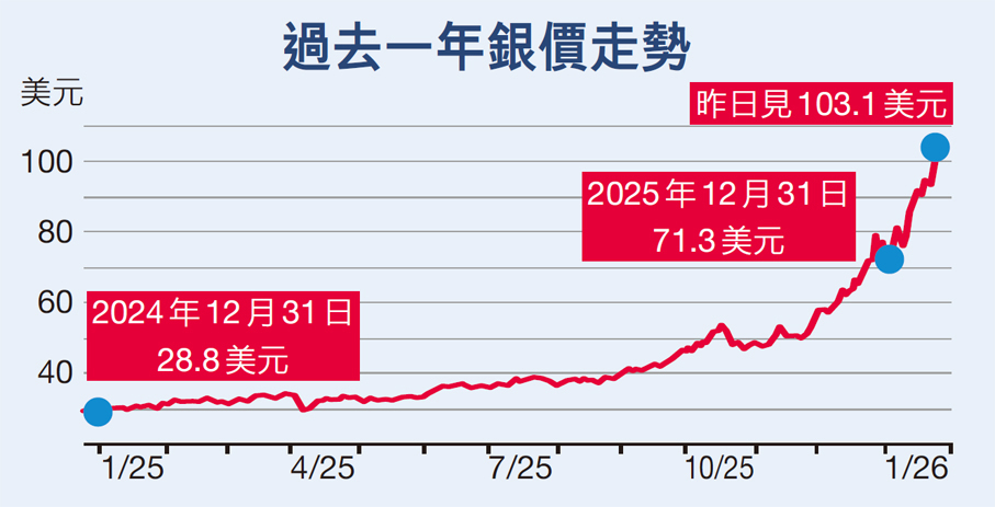 踏入2026年1月,國際金銀價格受地緣政治緊張及美元信用疑慮影響暴漲。現貨金價逼近5,000美元大關,每盎司達4,987美元,今年已累升15.4%。現貨銀價升幅更為誇張,突破100美元關口,每盎司高見103美元,今年已累積44.7%的升幅,開局牛氣沖天到得人驚。內地投資者趁勢「買漲不買跌」,深圳水貝黃金交易中心掀搶購熱潮,有炒家斥資200萬元人民幣,一次過掃貨80公斤銀條及銀板,計劃待價格再漲四五成甚至翻倍後轉手獲利。前海開源基金首席經濟學家、基金經理楊德龍認為,美國政府債台高築,美元超發導致國際資本對其信用產生質疑,是導致金銀價格大漲的主因。