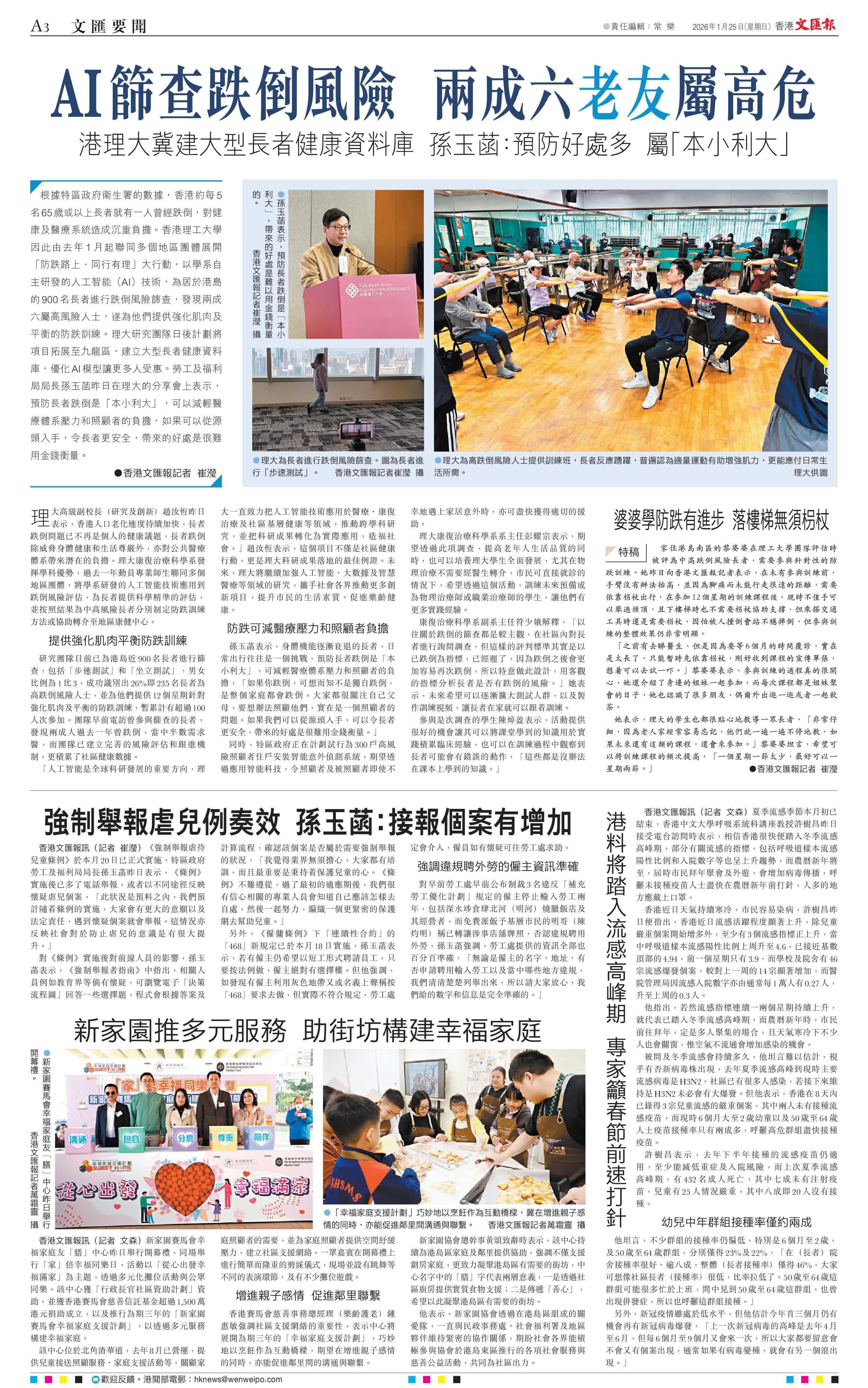 (香港文匯報記者 崔瀅)根據特區政府衞生署的數據,香港約每5名65歲或以上長者就有一人曾經跌倒,對健康及醫療系統造成沉重負擔。香港理工大學因此由去年1月起聯同多個地區團體展開「防跌路上·同行有理」大行動,以學系自主研發的人工智能(AI)技術,為居於港島的900名長者進行跌倒風險篩查,發現兩成六屬高風險人士,遂為他們提供強化肌肉及平衡的防跌訓練。理大研究團隊日後計劃將項目拓展至九龍區,建立大型長者健康資料庫,優化AI模型讓更多人受惠。勞工及福利局局長孫玉菡昨日在理大的分享會上表示,預防長者跌倒是「本小利大」,可以減輕醫療體系壓力和照顧者的負擔,如果可以從源頭入手,令長者更安全,帶來的好處是很難用金錢衡量。