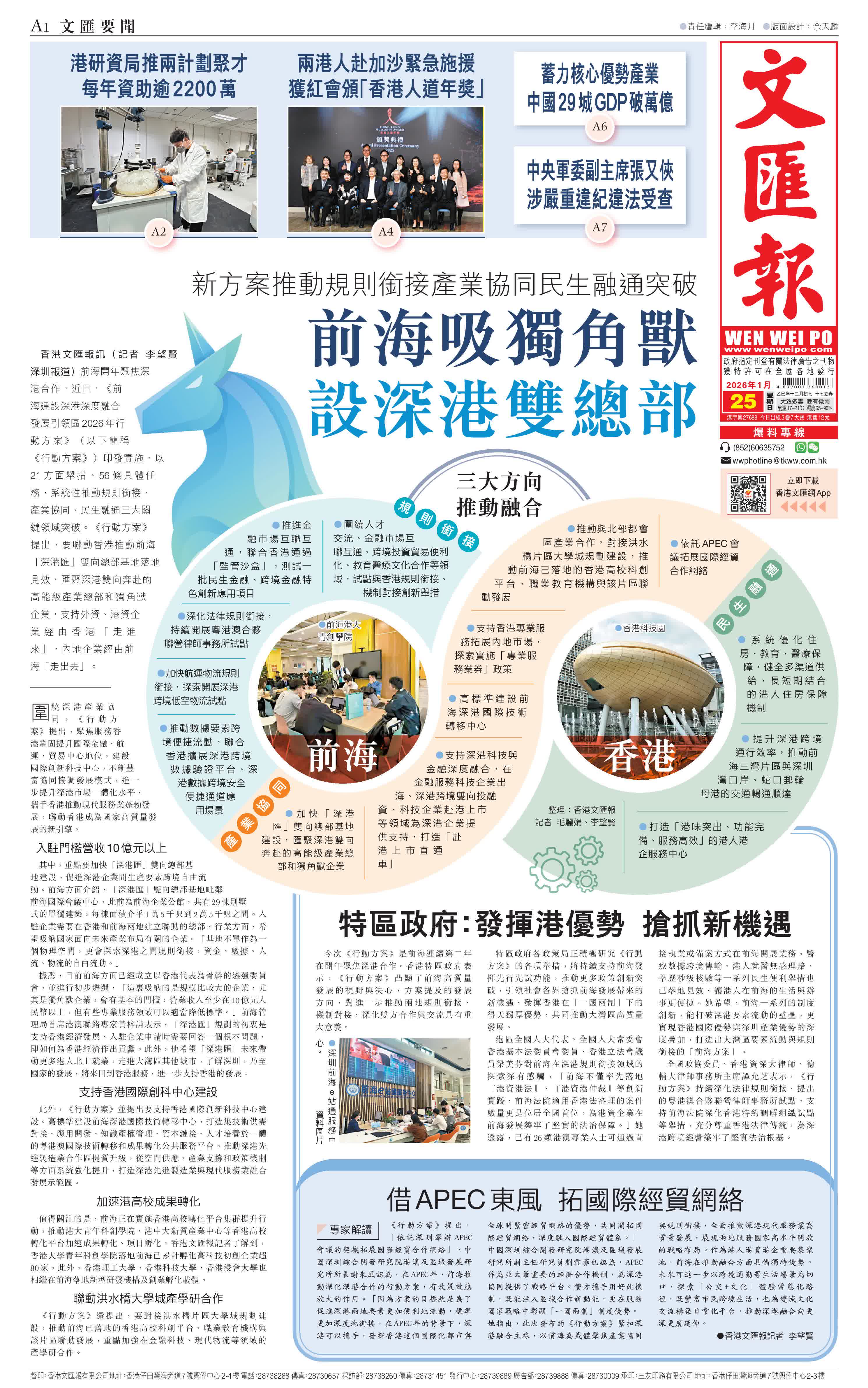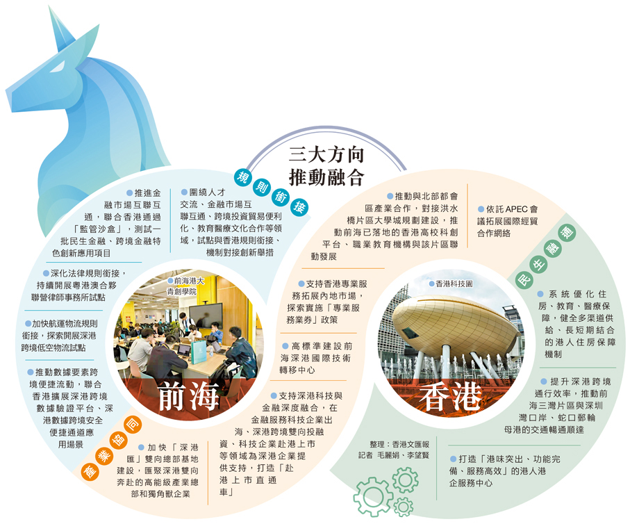 香港文匯報訊(記者 李望賢 深圳報道)前海開年聚焦深港合作,近日,《前海建設深港深度融合發展引領區2026年行動方案》(以下簡稱《行動方案》)印發實施,以21方面舉措、56條具體任務,系統性推動規則銜接、產業協同、民生融通三大關鍵領域突破。《行動方案》提出,要聯動香港推動前海「深港匯」雙向總部基地落地見效,匯聚深港雙向奔赴的高能級產業總部和獨角獸企業,支持外資、港資企業經由香港「走進來」,內地企業經由前海「走出去」。