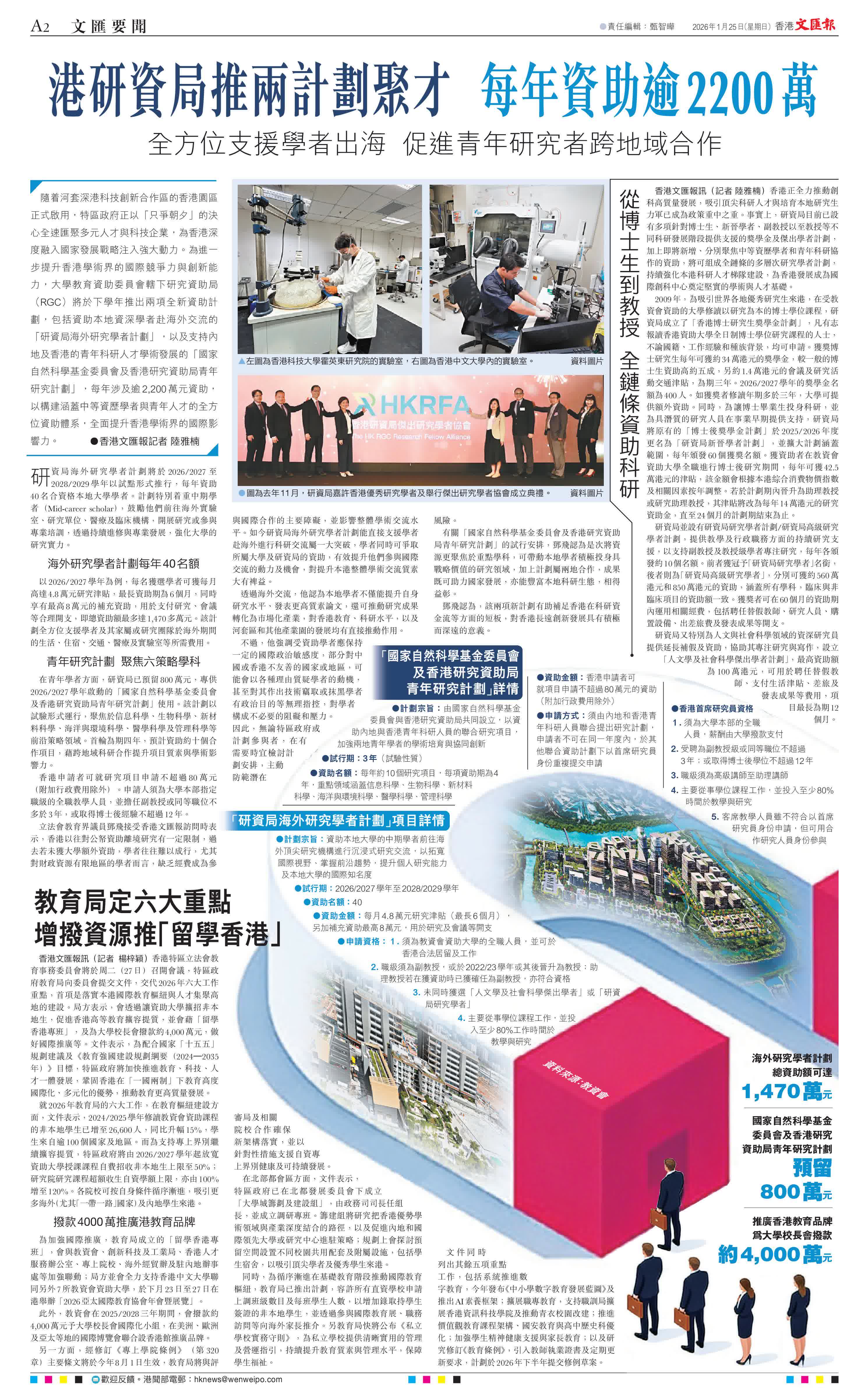 (香港文匯報記者 陸雅楠)隨着河套深港科技創新合作區的香港園區正式啟用,特區政府正以「只爭朝夕」的決心全速匯聚多元人才與科技企業,為香港深度融入國家發展戰略注入強大動力。為進一步提升香港學術界的國際競爭力與創新能力,大學教育資助委員會轄下研究資助局(RGC)將於下學年推出兩項全新資助計劃,包括資助本地資深學者赴海外交流的「研資局海外研究學者計劃」,以及支持內地及香港的青年科研人才學術發展的「國家自然科學基金委員會及香港研究資助局青年研究計劃」,每年涉及逾2,200萬元資助,以構建涵蓋中等資歷學者與青年人才的全方位資助體系,全面提升香港學術界的國際影響力。