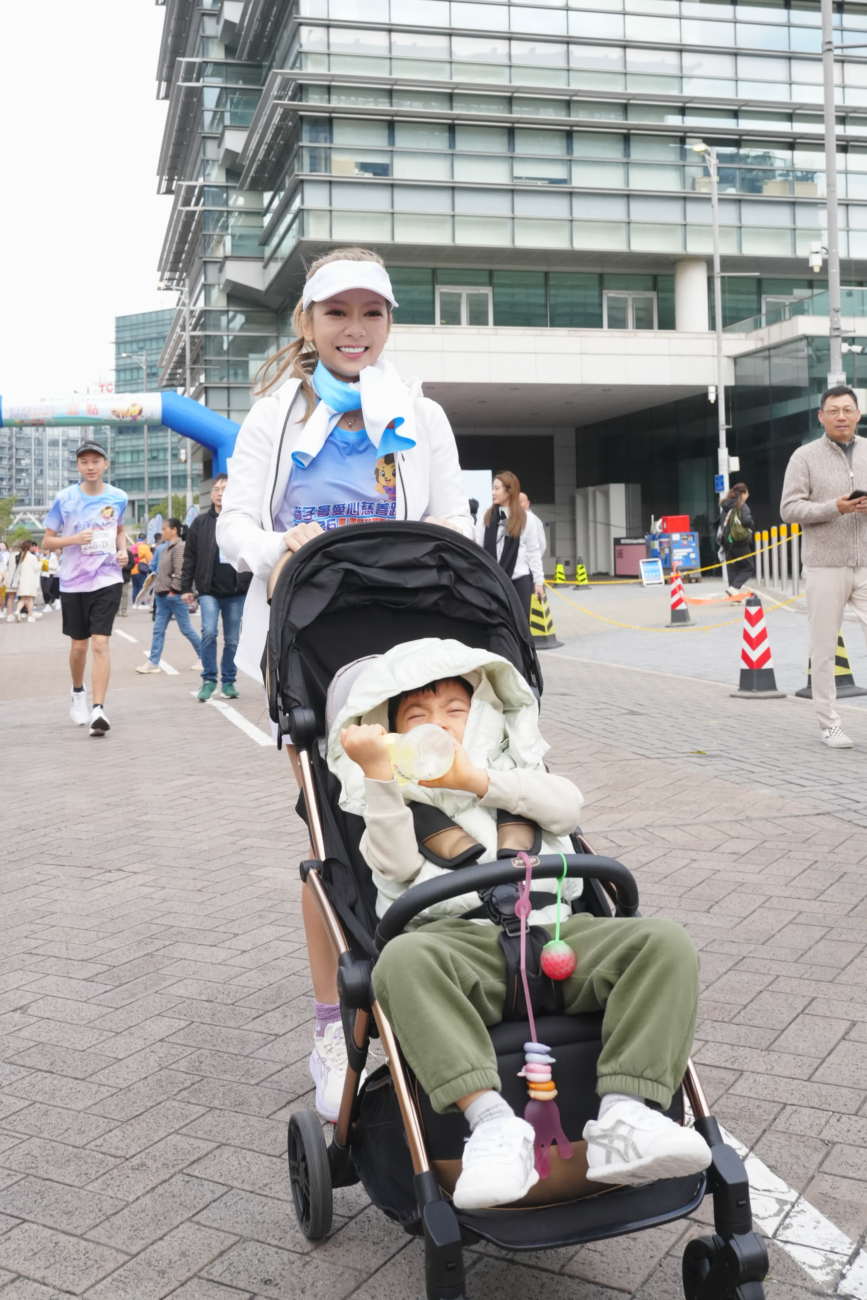 何雁詩推着坐在BB車的兒子,以母子檔完成賽事,兩人更開心展示完成賽事後獲得的獎牌。何雁詩開心能和兒子一起落場,她說:「原本Fred(丈夫鄭俊弦)想帶小朋友一齊參與,但他因爲今天要做舞台劇未能出現,始終星期日想同小朋友出街玩,不想兩公婆也忙,最後都是決定帶Asher出來。Asher今日玩得開心,他對聲音好敏感,起步及返回場地時聽到好大聲音會有點驚;但剛才望着吐露港跑時不停笑,尤其見到有些跑手穿着吹氣馬仔衫更加開心。」