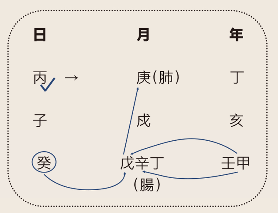 首先庚金代表肺及肺功能,當戊土健康的狀態時就代表肌肉細胞,遇甲剋戊成腫瘤,加上強甲木反剋辛金腸,於是消化系統未能有效將食物運化,變成痰濕,不健康的代謝物,積聚異變。日柱的癸水,成了癌病滋生地,戊合癸水,遇丙火就發惡成火局剋金,包括了辛金腸及庚金肺﹗