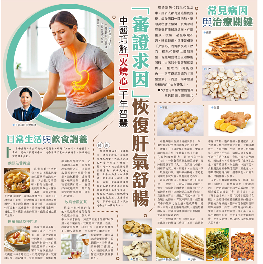 在步調匆忙的現代生活中,許多人都有過這樣的困擾:飯後胸口一陣灼熱,喉頭莫名湧上酸澀,夜裏平躺時更覺有股酸氣逆衝,伴隨腹脹、噯氣,甚至喉嚨不適、咳嗽難癒。這便是俗稱「火燒心」的胃酸反流。然而,在現代醫學以抑制胃酸、促進蠕動為主流治療的同時,古老的中醫智慧卻提供了一種截然不同的視角——它不僅是單純的「胃酸過多」,而是一場牽連全身機能的「失衡警訊」。