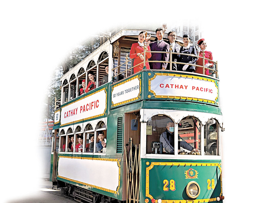 為慶祝成立80周年,國泰航空昨日舉行電車巡遊活動,塗上該品牌經典復古塗裝的電車沿屈地街電車廠駛至北角,多名國泰機艙服務員及地勤人員換上10款由1940年代至今的歷代制服乘搭電車,沿途向市民揮手致意。國泰顧客及商務總裁劉凱詩表示,4輛特色電車已於上周起至2月19日,穿梭於港島不同路線,前線員工今年亦會穿上歷代經典懷舊制服執勤,帶領市民親歷一趟時光之旅。
