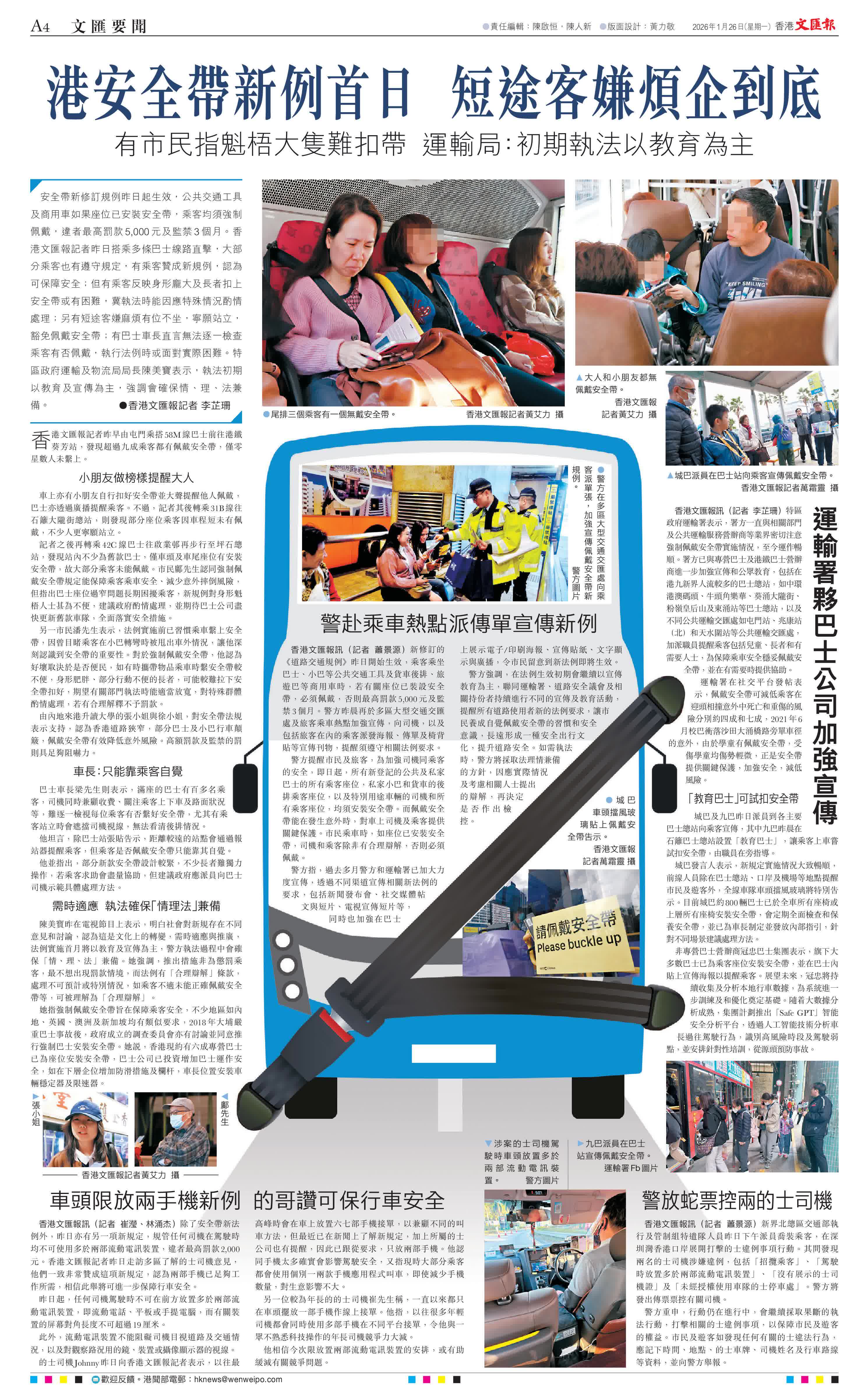 (香港文匯報記者 李芷珊)安全帶新修訂規例昨日起生效,公共交通工具及商用車如果座位已安裝安全帶,乘客均須強制佩戴,違者最高罰款5,000元及監禁3個月。香港文匯報記者昨日搭乘多條巴士線路直擊,大部分乘客也有遵守規定,有乘客贊成新規例,認為可保障安全;但有乘客反映身形龐大及長者扣上安全帶或有困難,冀執法時能因應特殊情況酌情處理;另有短途客嫌麻煩有位不坐,寧願站立,豁免佩戴安全帶;有巴士車長直言無法逐一檢查乘客有否佩戴,執行法例時或面對實際困難。特區政府運輸及物流局局長陳美寶表示,執法初期以教育及宣傳為主,強調會確保情、理、法兼備。