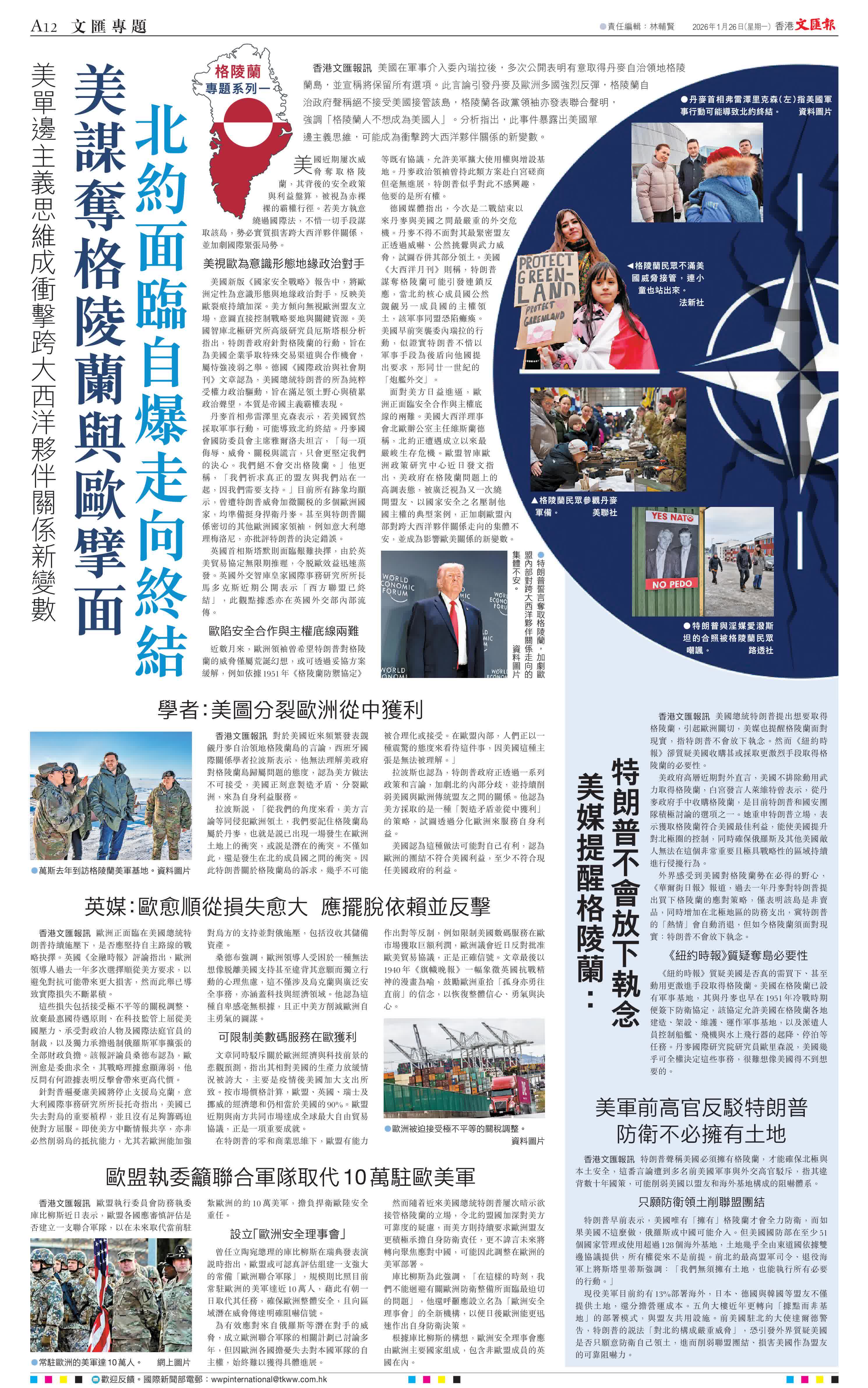 香港文匯報訊 美國在軍事介入委內瑞拉後,多次公開表明有意取得丹麥自治領地格陵蘭島,並宣稱將保留所有選項。此言論引發丹麥及歐洲多國強烈反彈,格陵蘭自治政府聲稱絕不接受美國接管該島,格陵蘭各政黨領袖亦發表聯合聲明,強調「格陵蘭人不想成為美國人」。分析指出,此事件暴露出美國單邊主義思維,可能成為衝擊跨大西洋夥伴關係的新變數。