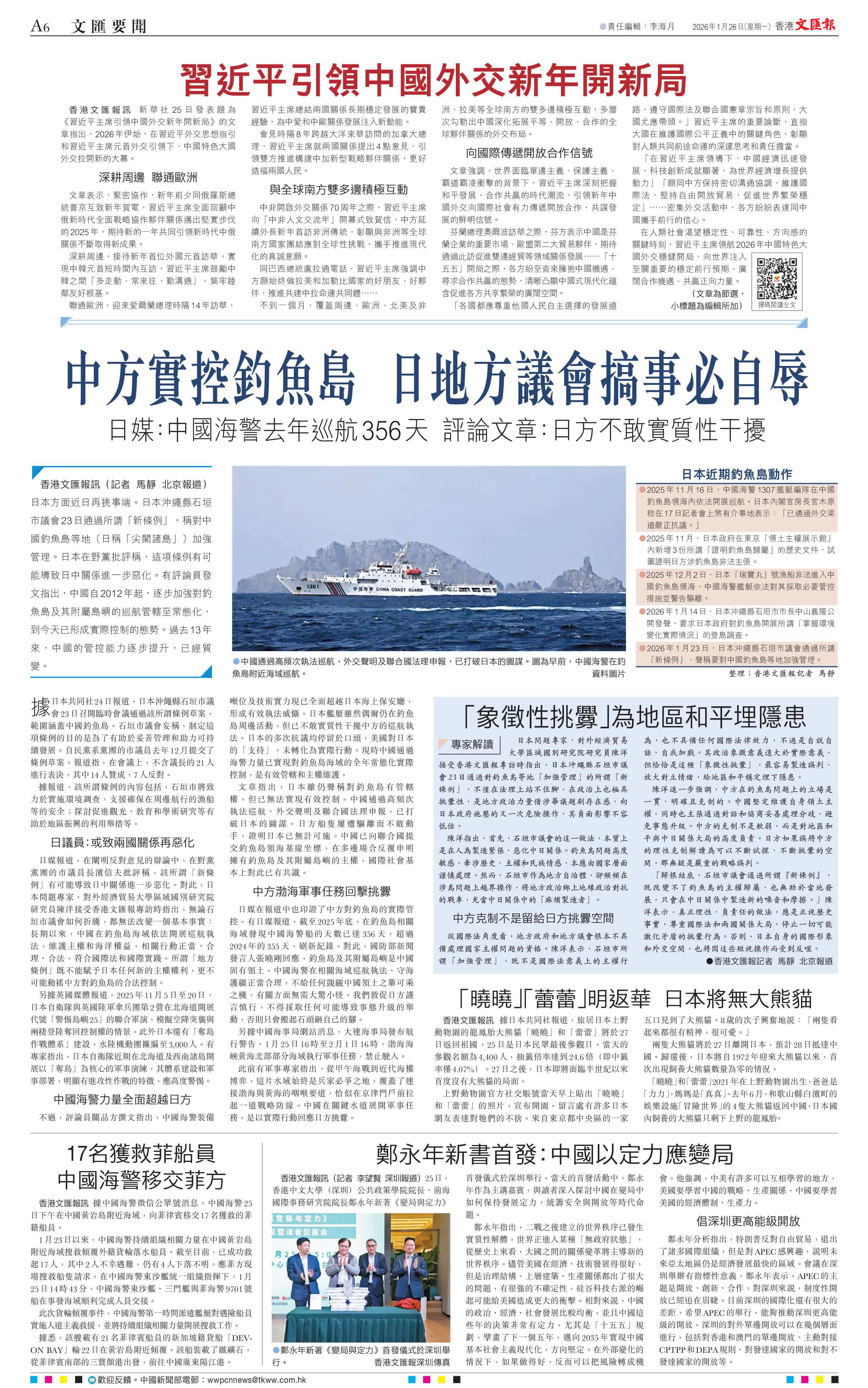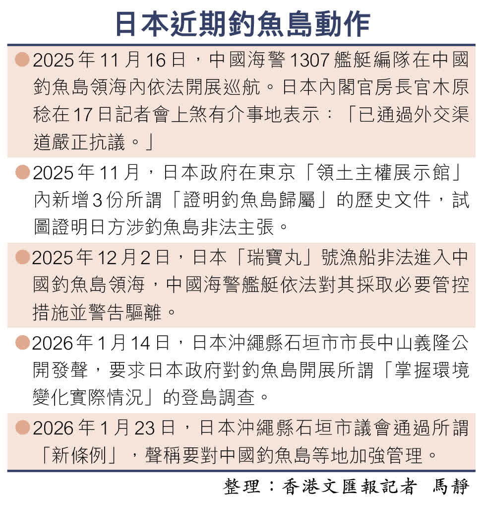 香港文匯報訊(記者 馬靜 北京報道)日本方面近日再挑事端。日本沖繩縣石垣市議會23日通過所謂「新條例」,稱對中國釣魚島等地(日稱「尖閣諸島」)加強管理。日本在野黨批評稱,這項條例有可能導致日中關係進一步惡化。有評論員發文指出,中國自2012年起,逐步加強對釣魚島及其附屬島嶼的巡航管轄至常態化,到今天已形成實際控制的態勢。過去13年來,中國的管控能力逐步提升,已經質變。