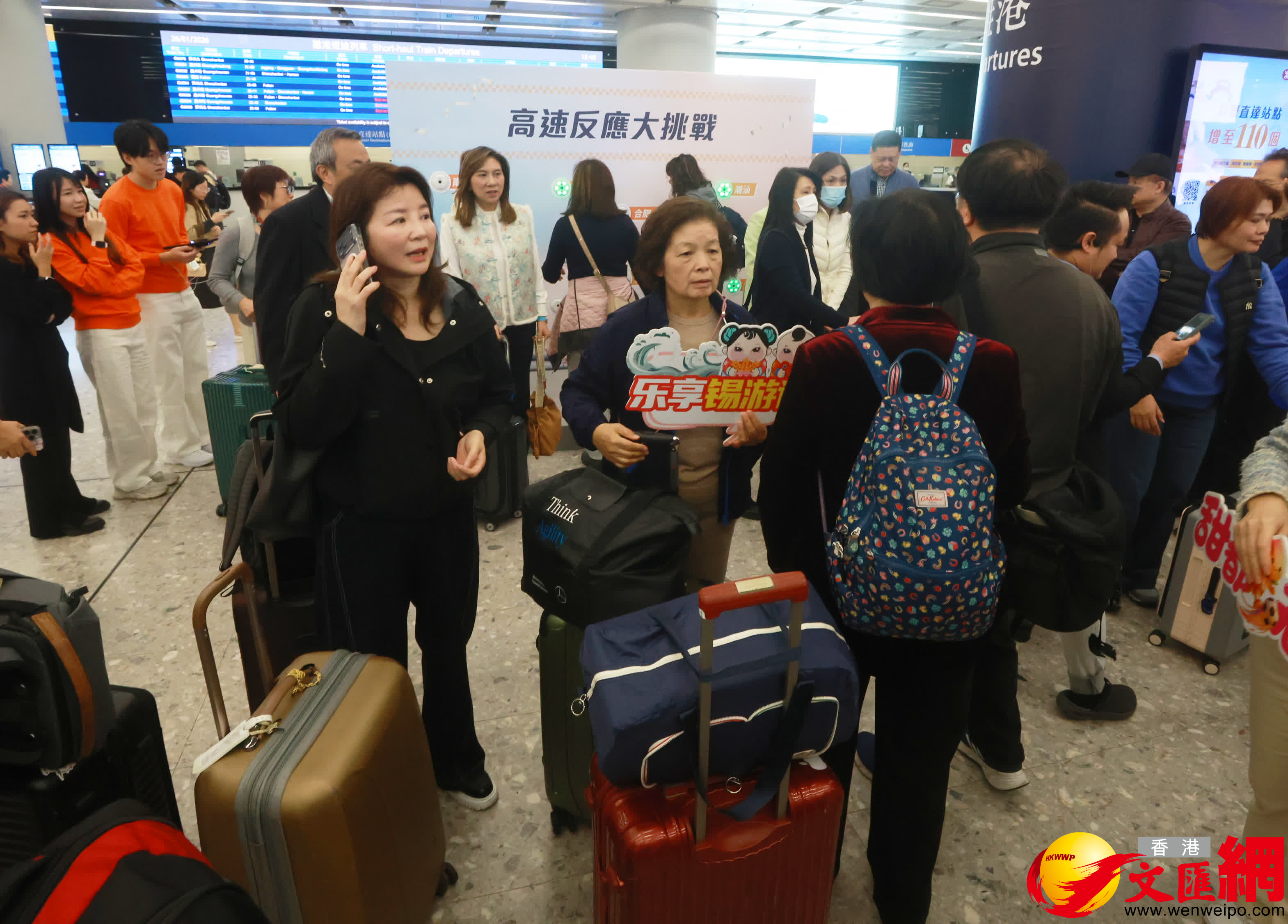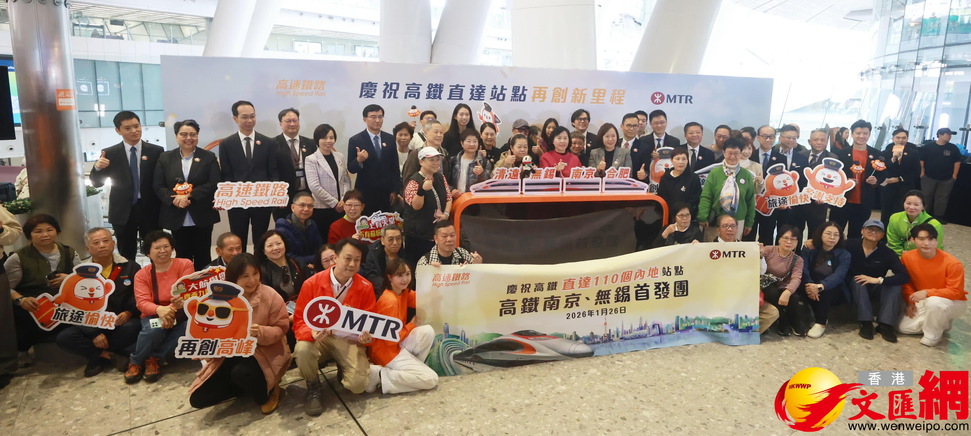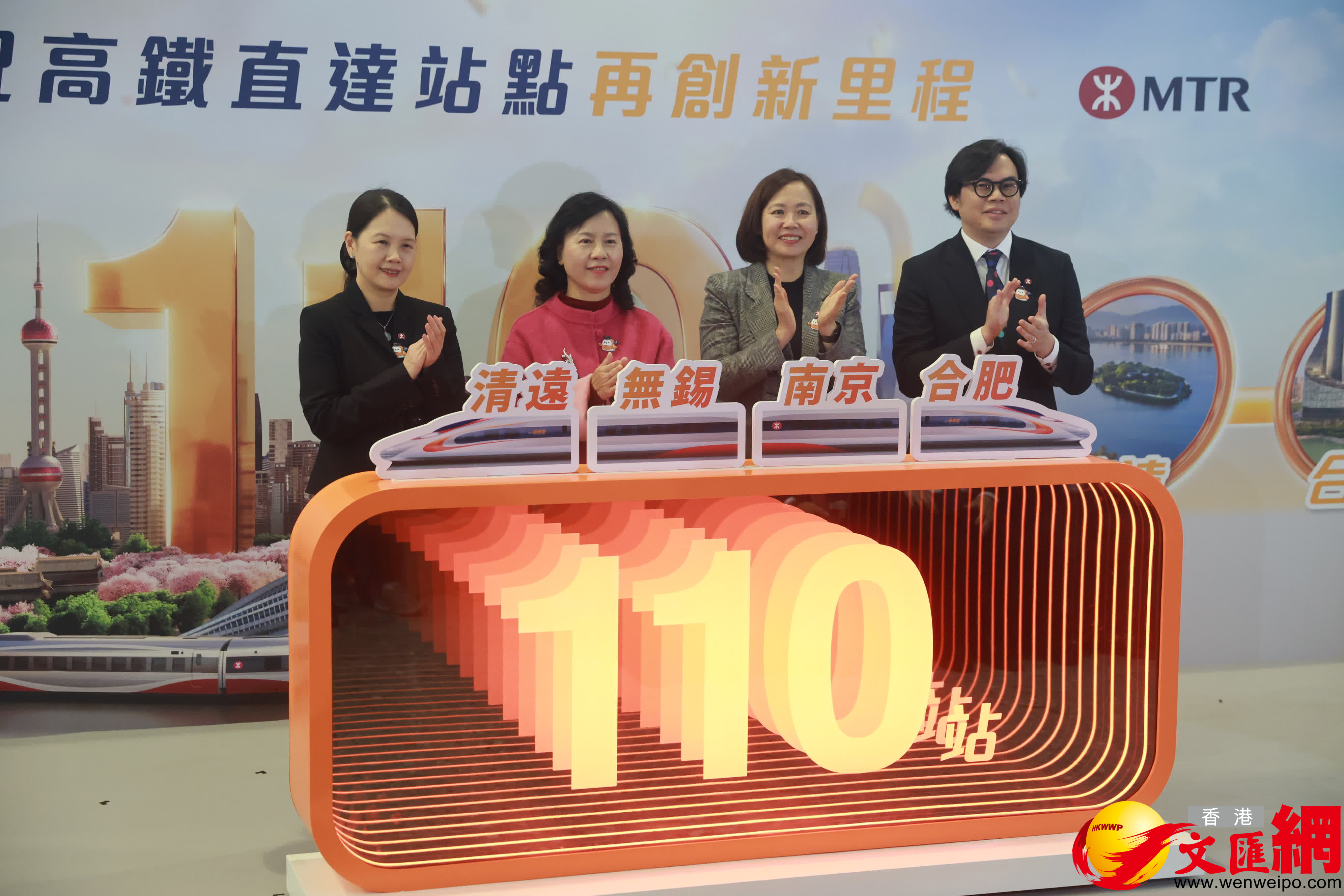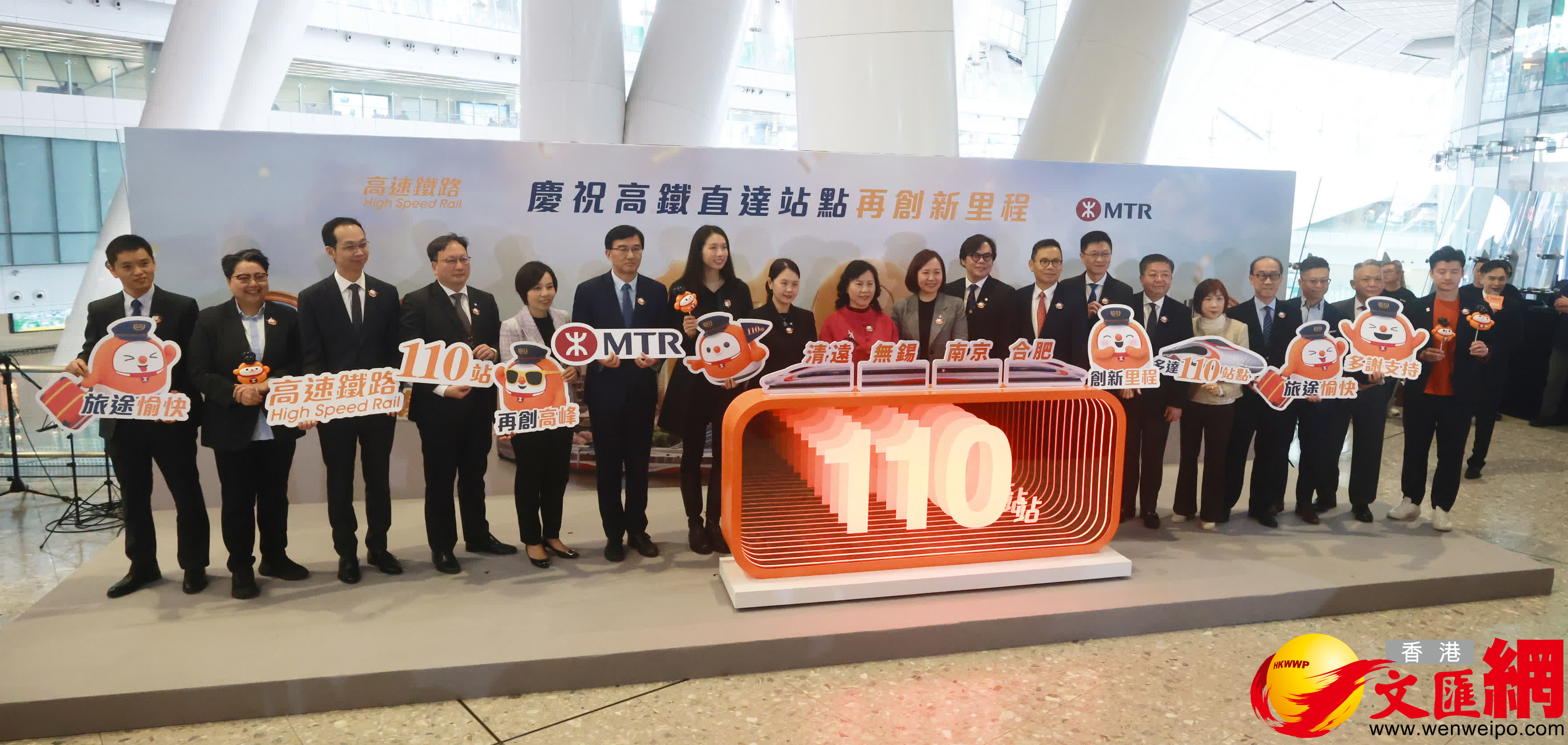 為慶祝高速鐵路(香港段)直達站點達110個這重要里程碑,港鐵公司今日(26日)於香港西九龍站舉行首航慶祝活動。運輸及物流局局長陳美寶、港鐵公司行政總裁楊美珍與公司管理層等出席。(香港文匯報記者郭木又攝)