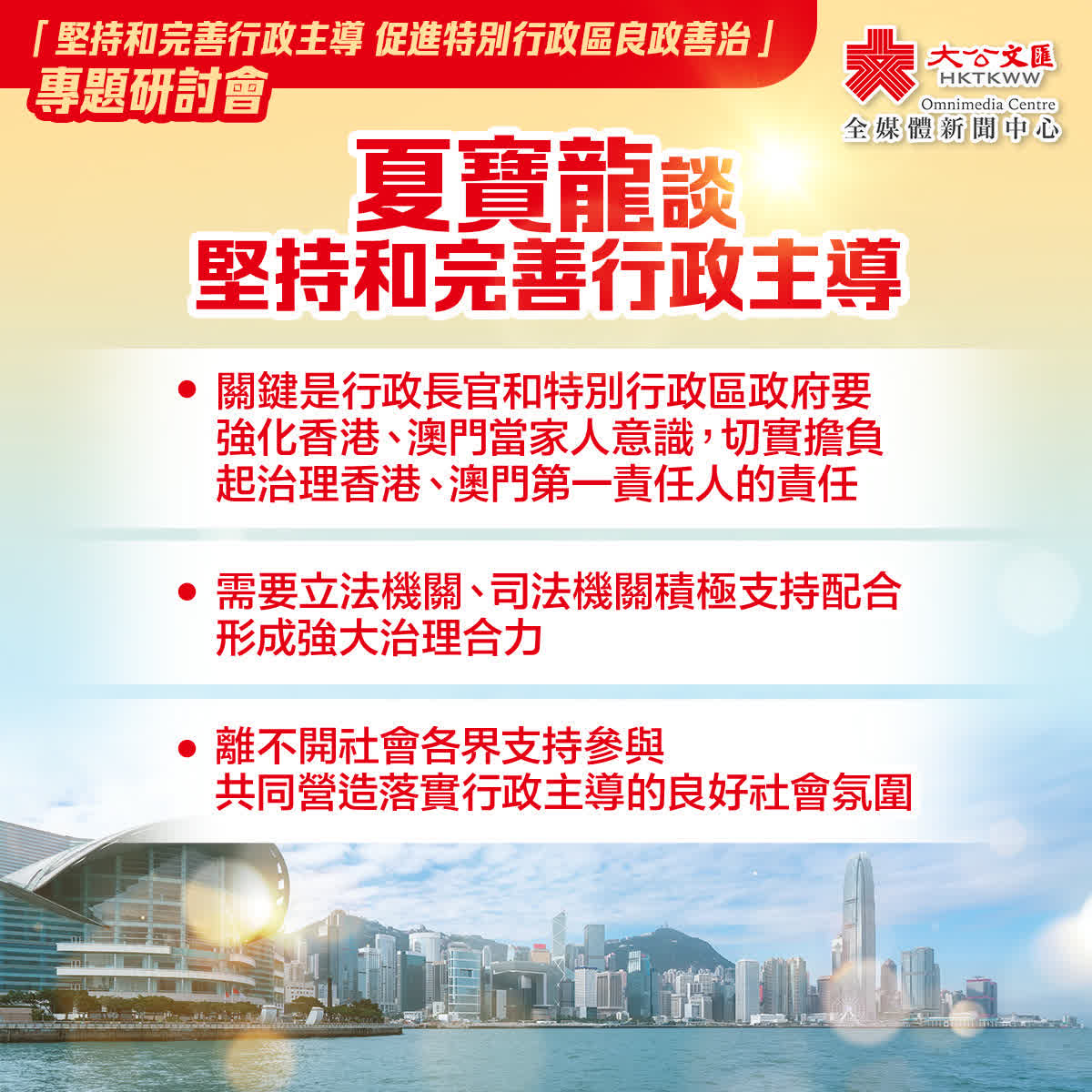 夏寶龍續指,堅持和完善行政主導,離不開社會各界支持參與,共同營造落實行政主導的良好社會氛圍。行政主導要落實到位,歸根到底有賴香港、澳門社會各界和廣大市民的大力支持和共同努力。香港、澳門是全體市民的共同家園,每位市民都是持份者、建設者、受益者。大家都要為了這個家,增強主人翁意識,立足自身崗位積極支持特別行政區政府依法施政,為促進香港、澳門長期繁榮穩定作出自己應有的貢獻。