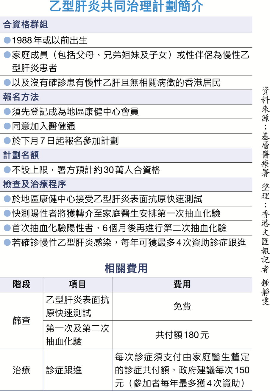 該計劃會透過私營醫療市場的共付模式,為合資格人士提供乙肝篩查及長期管理服務。參加者須先登記成為康健中心會員並同意加入醫健通,下月7日起可報名參加計劃。