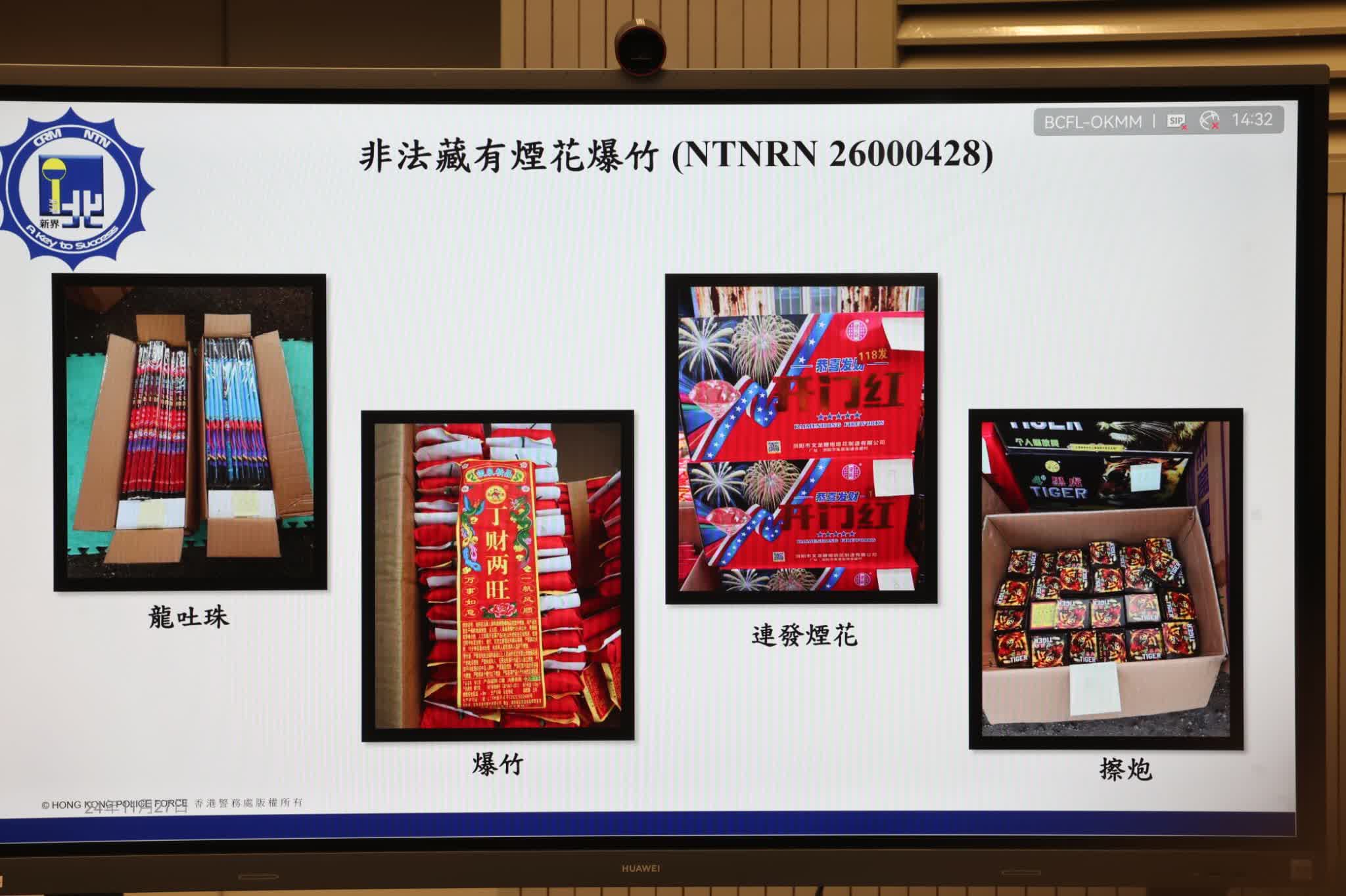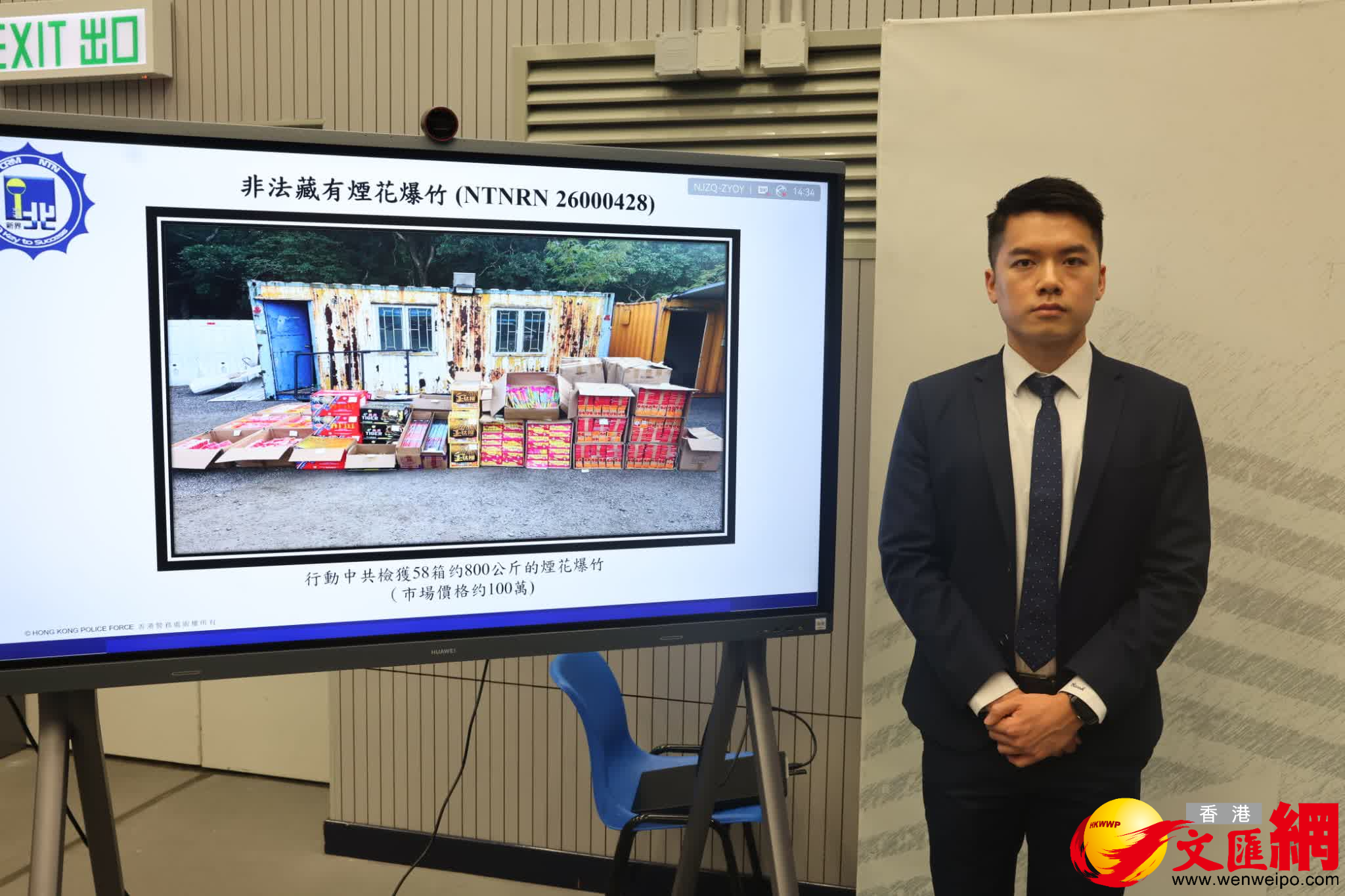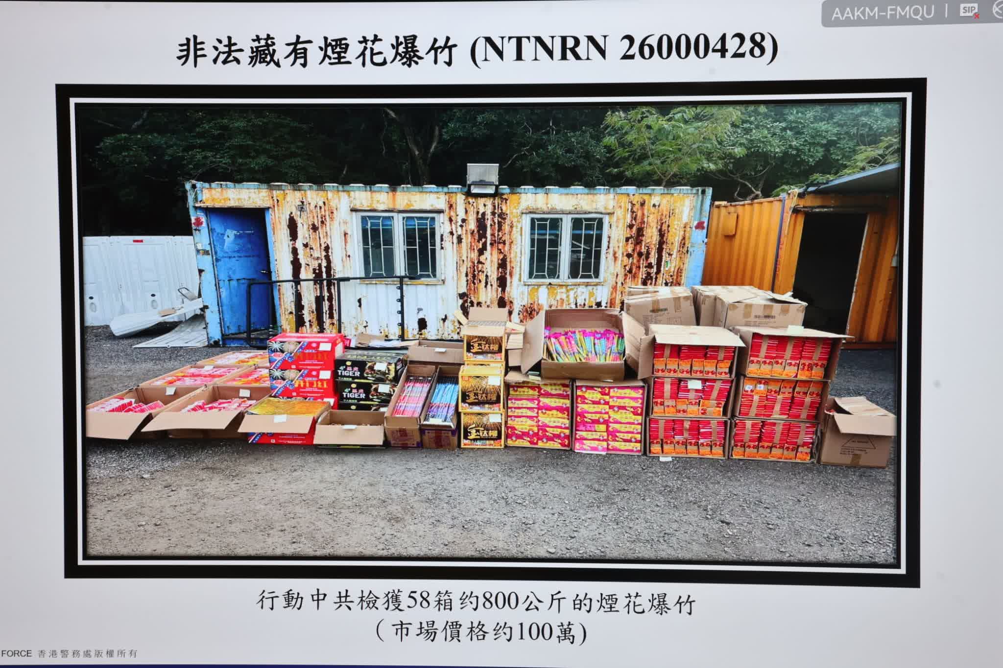 香港文匯報訊(記者 蕭景源)鑑於每年新年前俱有非法煙花的交易活動,警方致力透過情報主導行動,以打擊煙花炮竹相關罪行,並於煙花流入市面前予以截獲。新界北總區反三合會行動組第2隊高級督察郭文煒表示,經深入調查及情報分析後,人員在昨日(26日)下午約4時,在屯門大欖涌一帶展開針對非法藏有爆花炮竹的行動,成功拘捕一名37歲男子,並在其租用的一個貨櫃內,檢獲共58箱煙花,當中的種類包括龍吐珠、擦炮及炮仗等,總重約800公斤,市值約100萬港元。