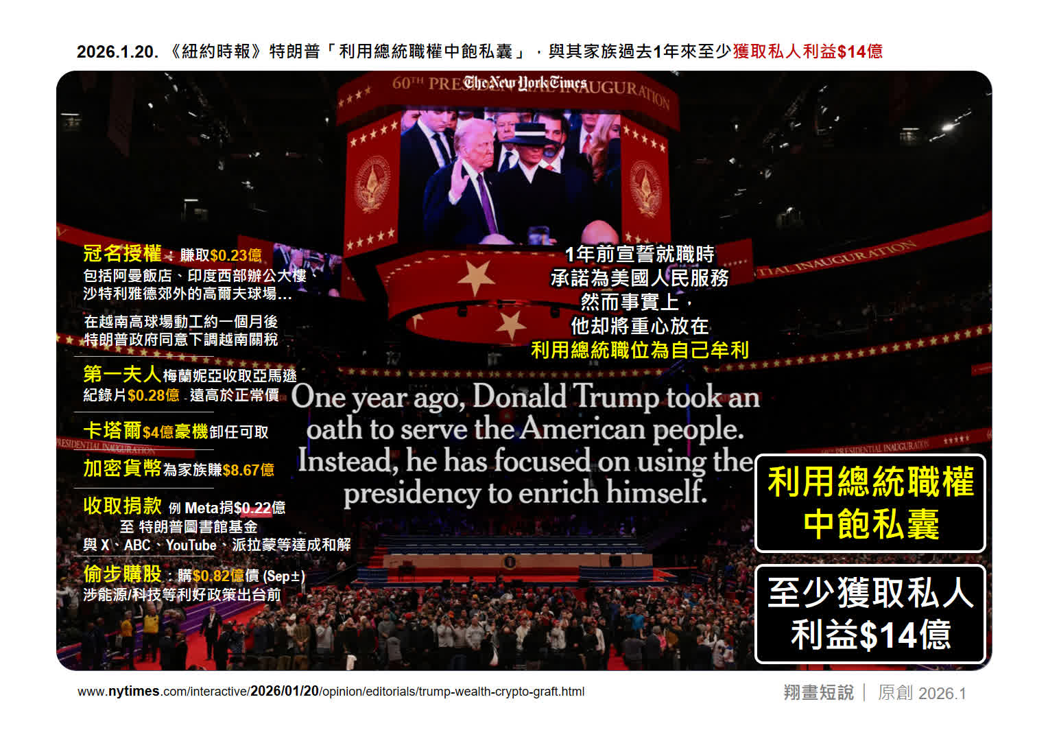根據《紐約時報》1月20日披露,特朗普就職一年來,已利用總統職權中飽私囊,通過冠名授權、加密貨幣等渠道攫取至少14億美元私人利益。這種「為政不仁、以權謀私」的執政邏輯,任意妄為將國家利益推向「金融戰」旋渦,摧毀二戰後由美國主導的國際秩序支柱。美國向外舉債遇困,缺乏資金支持國家運作,作為執掌這個250年歷史的任性總統,或將美國推向一場懸崖邊的非硝煙大戰。