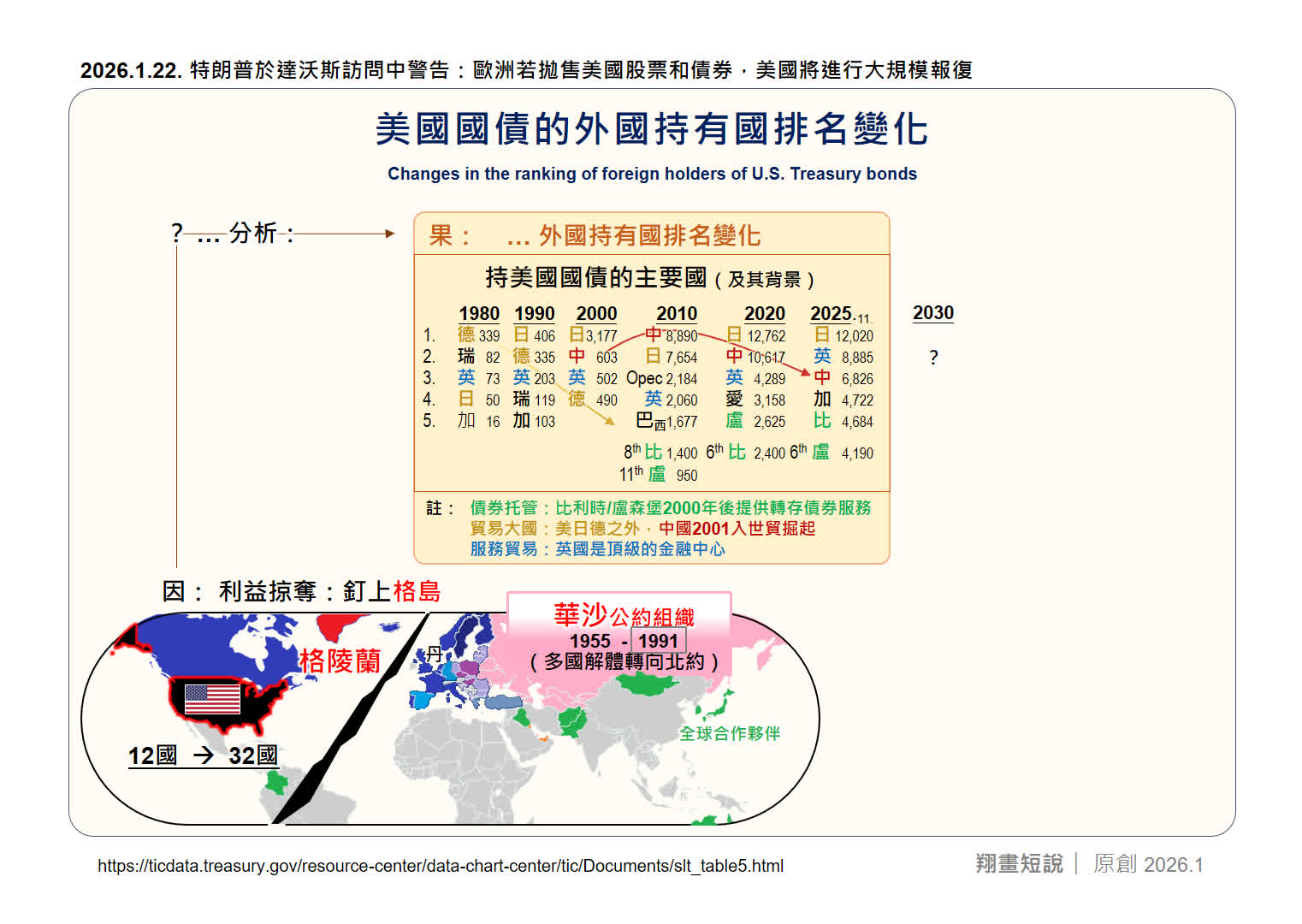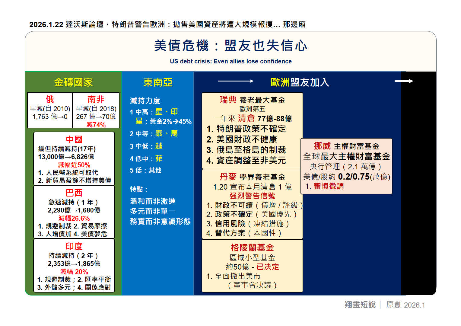 一月下旬,達沃斯論壇期間特朗普再拋驚言,繼續放話要奪取格陵蘭,更警告歐洲「拋售美元資產者將遭報復」。巧合的是,美債已現沽壓,引發的小型崩盤。這一切環環相扣,特朗普發起的不止是「貿易戰」,更間接推動了一場災難性的「金融戰」,面對手握超過3.6萬億美元美債的歐洲,其影響或將徹底動搖二戰後的既有國際秩序。