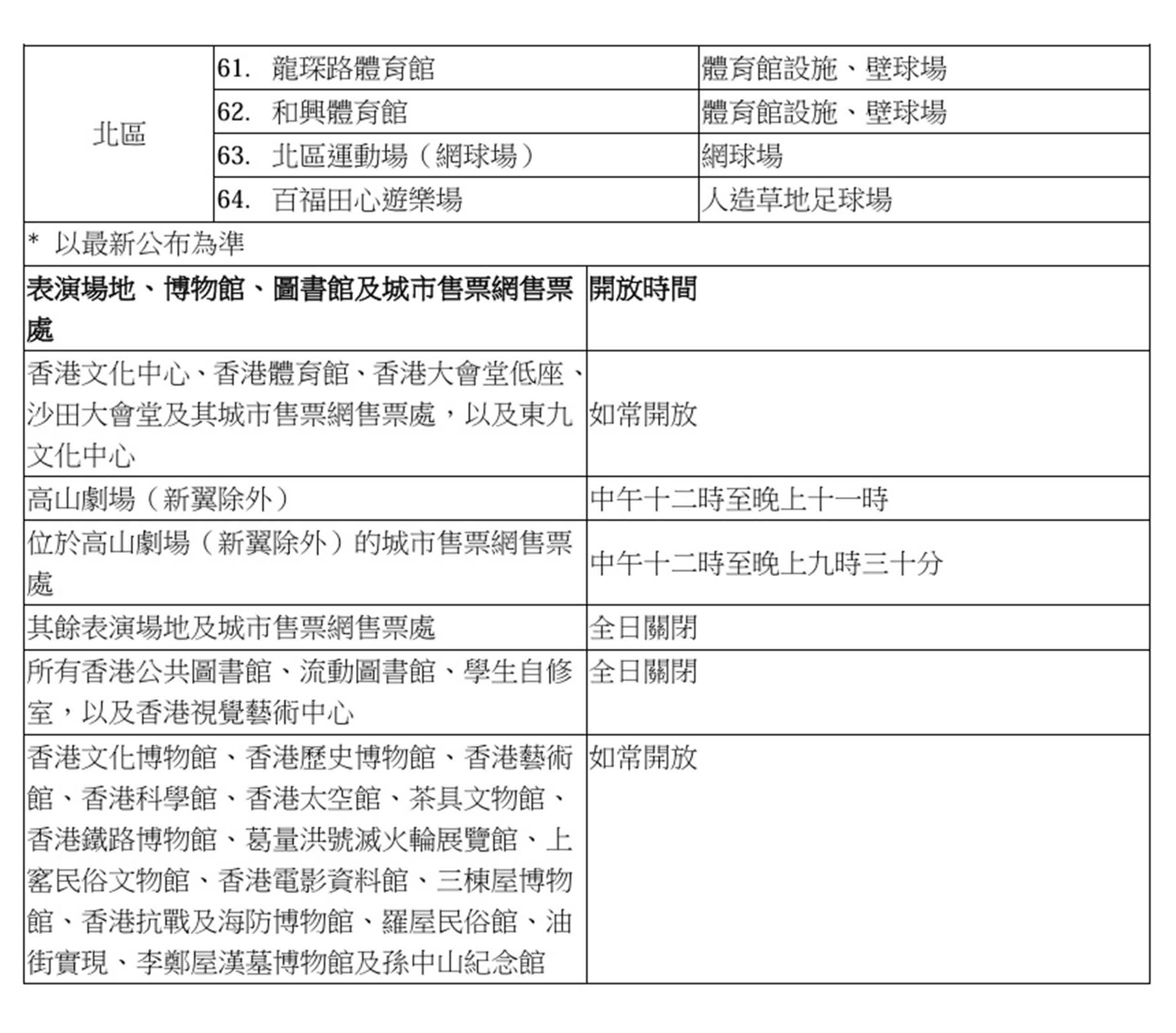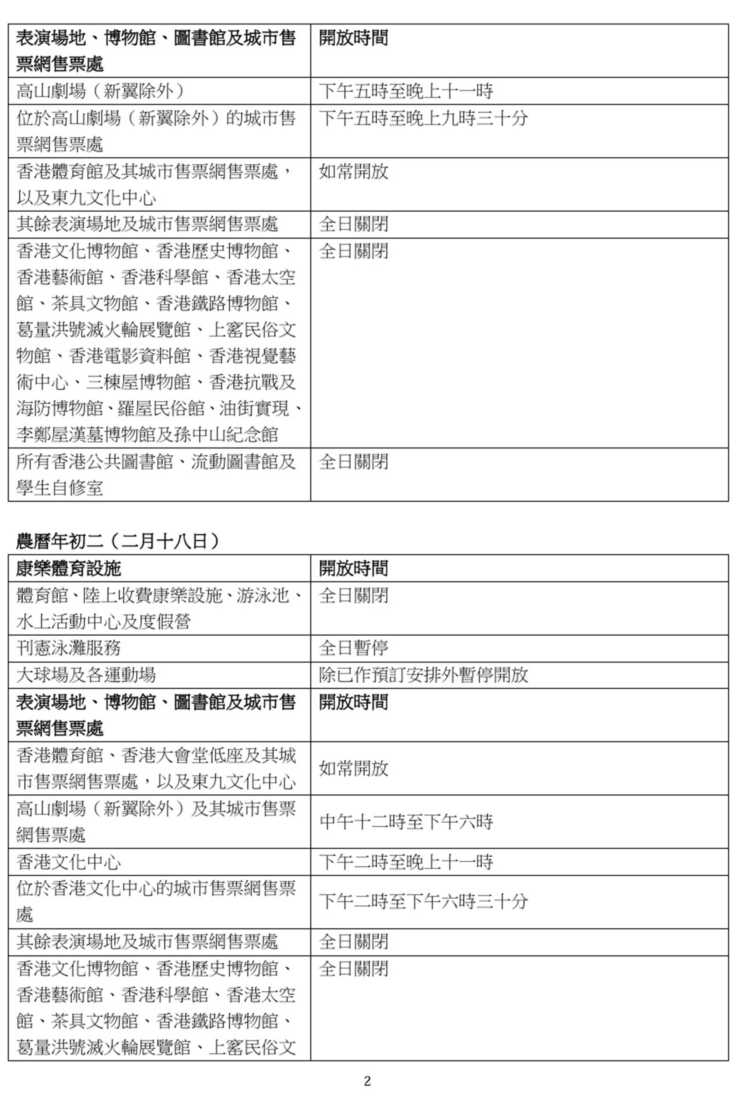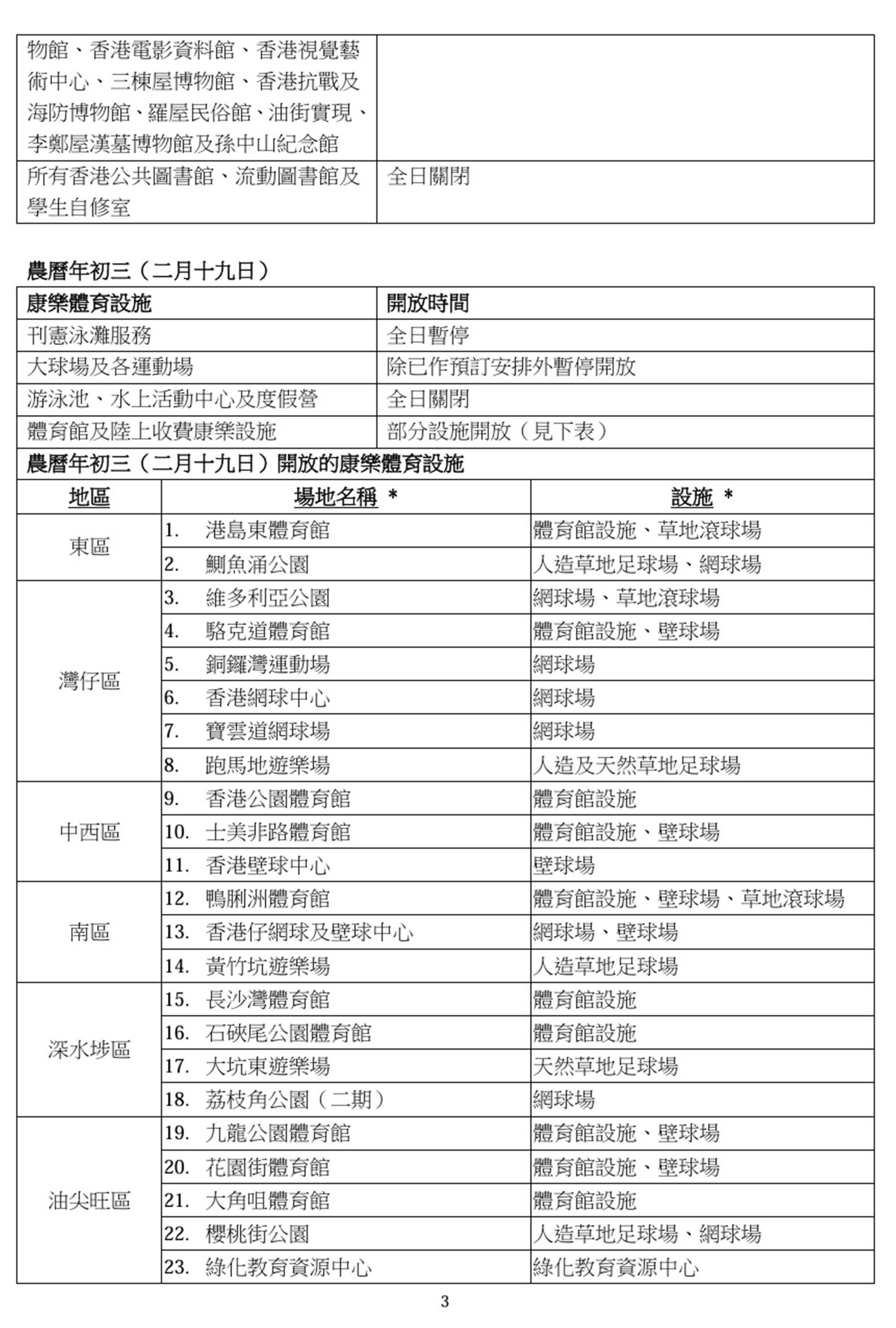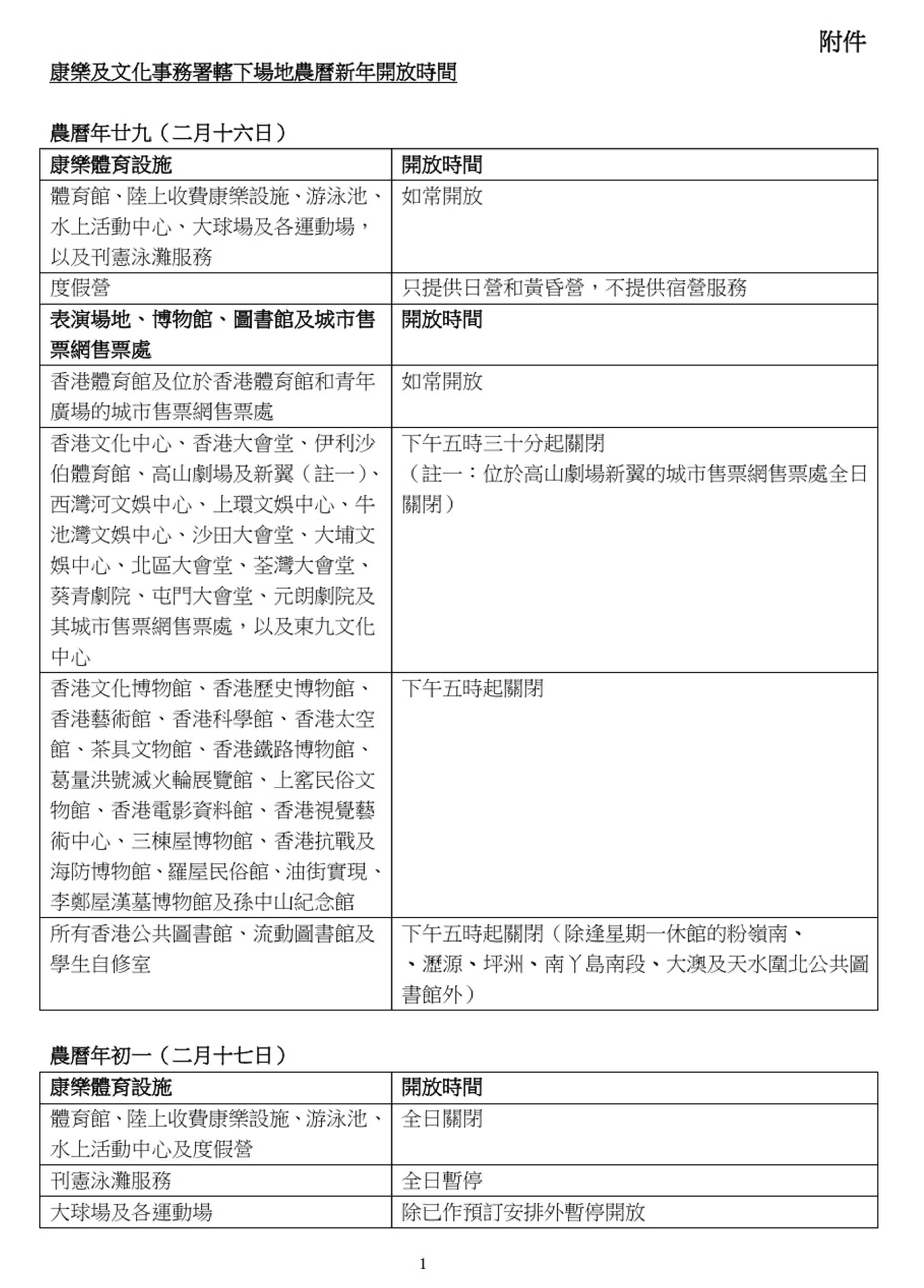 香港文匯報訊(記者 蕭景源)康樂及文化事務署(康文署)今日(27日)公布,轄下公園及遊樂場的戶外免費康體設施將於農曆新年假期期間照常開放,其他設施於農曆年廿九至年初三(2月16日至19日)期間的開放安排載於附件。所有設施會於年初四(2月20日)回復正常服務。