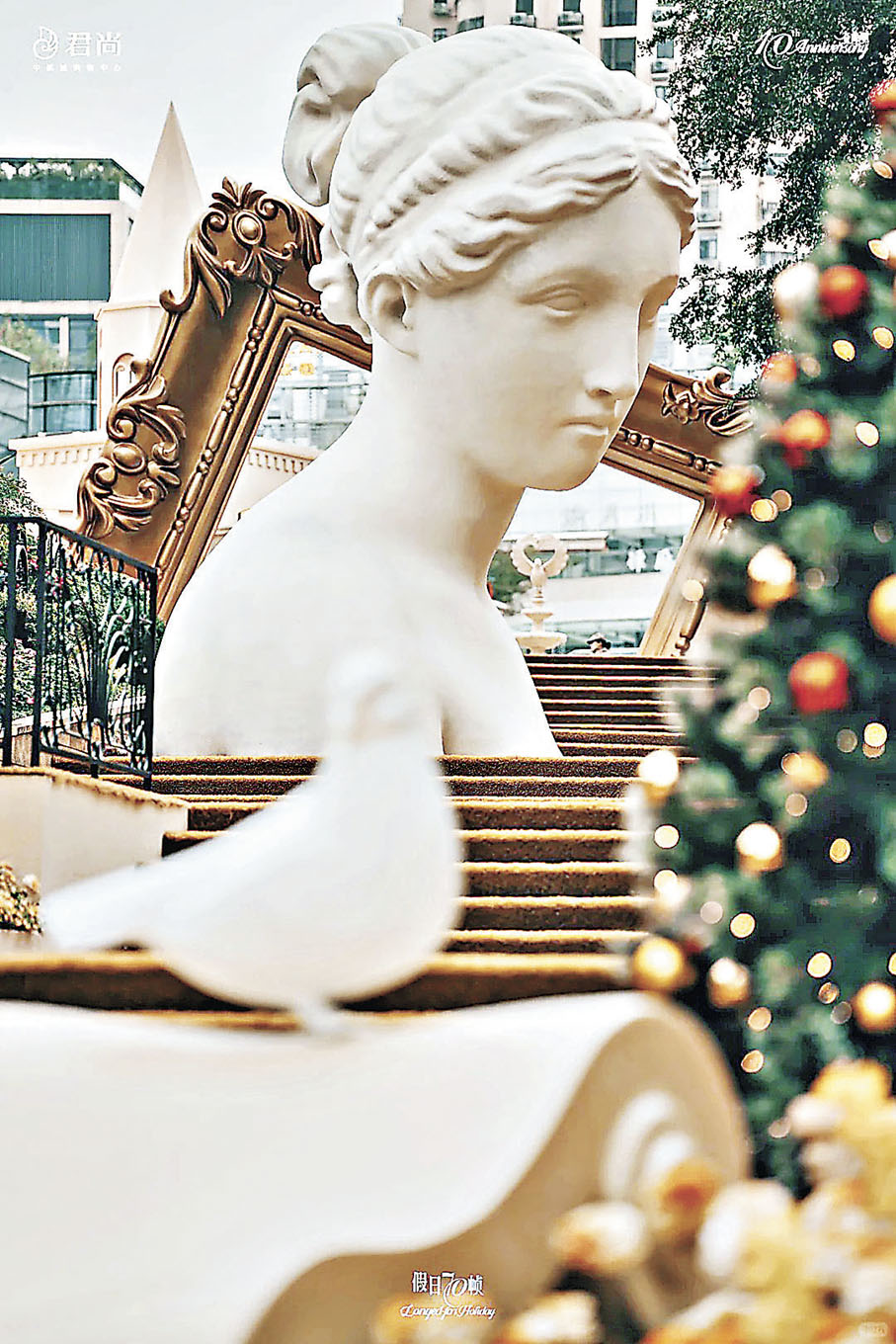 街區的歐式風格建築錯落有致,不管是仰拍、俯拍還是隨手拍,每一幀照片都令人驚艷,各位港客可以在一個風和日麗的日子前來,最佳時間是下午3時至5時,與伴侶、家人或閨蜜來到這裏,共赴一場浪漫盛宴。街區樓梯的超巨型石膏像、巨型畫框可謂標誌性打卡位之一,大家到達商場可先到樓梯位,文藝復興風格石膏像在階梯兩邊,旁邊亦有鑲住聖誕花環的巨型畫框,大家坐在石級上,與石膏像合影,背後畫框框住天空,陽光普照下微微柔光,下午更不時有白鴿飛來圍住團團轉,餵鴿子同時打卡,一次過滿足兩個願望。