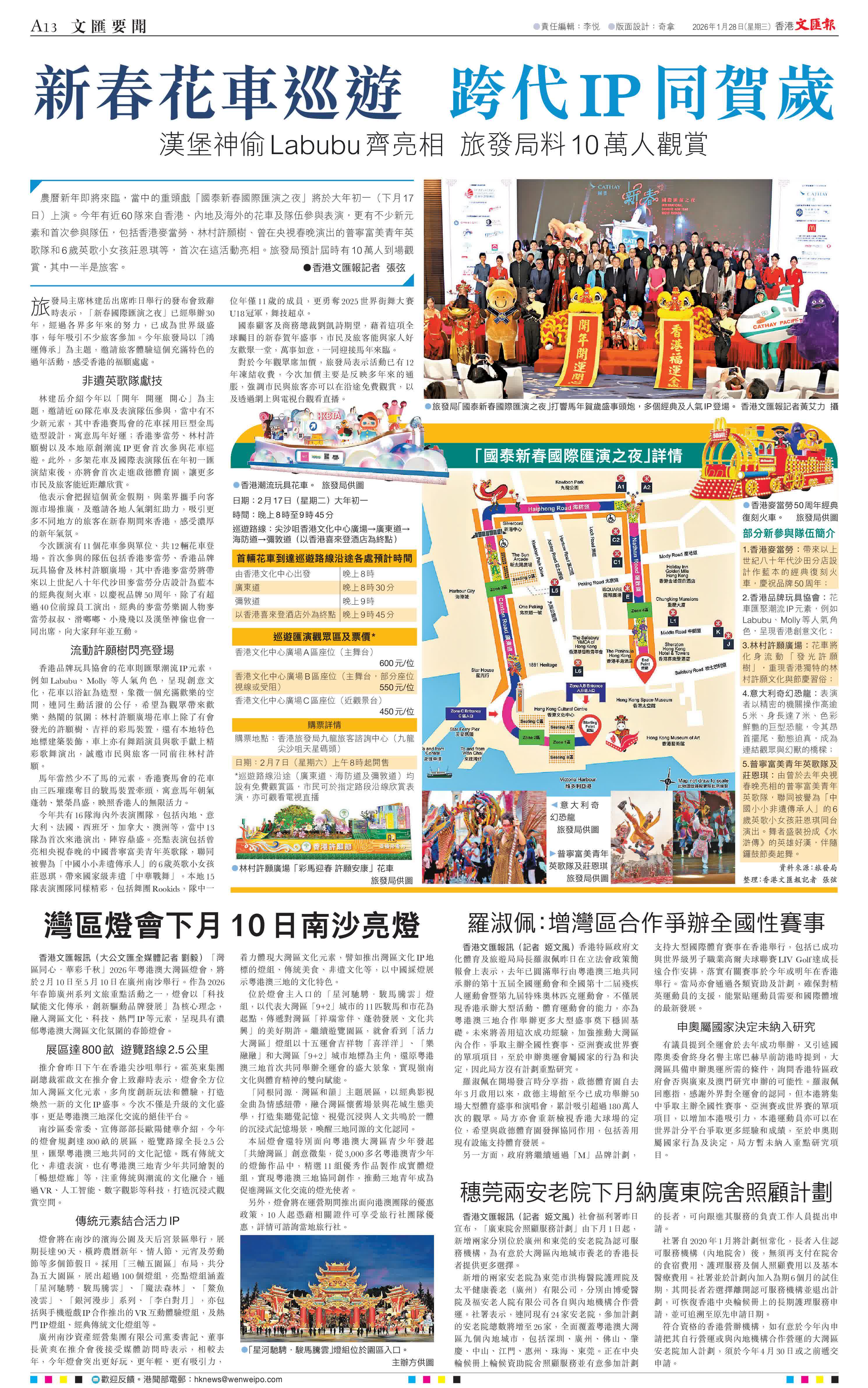 (香港文匯報記者 張弦)農曆新年即將來臨,當中的重頭戲「國泰新春國際匯演之夜」將於大年初一(下月17日)上演。今年有近60隊來自香港、內地及海外的花車及隊伍參與表演,更有不少新元素和首次參與隊伍,包括香港麥當勞、林村許願樹、曾在央視春晚演出的普寧富美青年英歌隊和6歲英歌小女孩莊恩琪等,首次在這活動亮相。旅發局預計屆時有10萬人到場觀賞,其中一半是旅客。