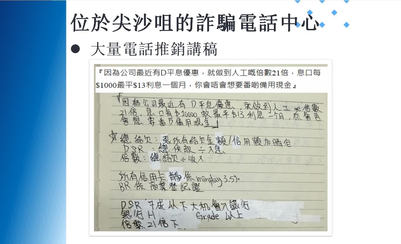 而在尖沙咀的電話詐騙中心,警方拘捕一男一女,涉嫌透過電話推銷(Cold Call)進行詐騙。該詐騙中心面積約1,000平方呎,內有大量電話推銷講稿、約300個電話號碼清單,包括該些電話號碼的人名和身份證號碼以及借貸文件,相信集團從一些不法途徑取得一些潛在受害者的個人資料及聯絡方法,從而接觸他們嘗試詐騙,初步估計涉案受害人超過100名。集團更設有「業績龍虎榜」,以鼓勵成員加強行騙以爭取「業績」。