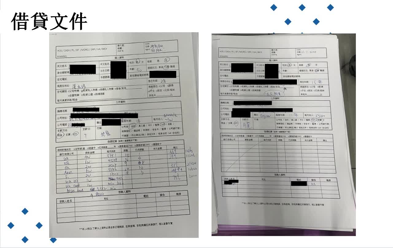 另外,集團分工明確,有專人負責以電話接觸受害人並介紹所謂的「個人小型破產計劃」;亦有專人負責面見及游說,並以會計公司作為幌子,增加受害人的信任誘騙受害人;另有專人陪同受害人申請貸款,其後馬上從受害人手上取走貸款。