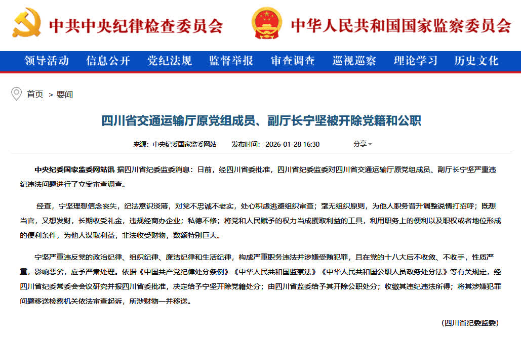據四川省紀委監委消息:日前,經四川省委批准,四川省紀委監委對四川省交通運輸廳原黨組成員、副廳長寧堅嚴重違紀違法問題進行了立案審查調查。