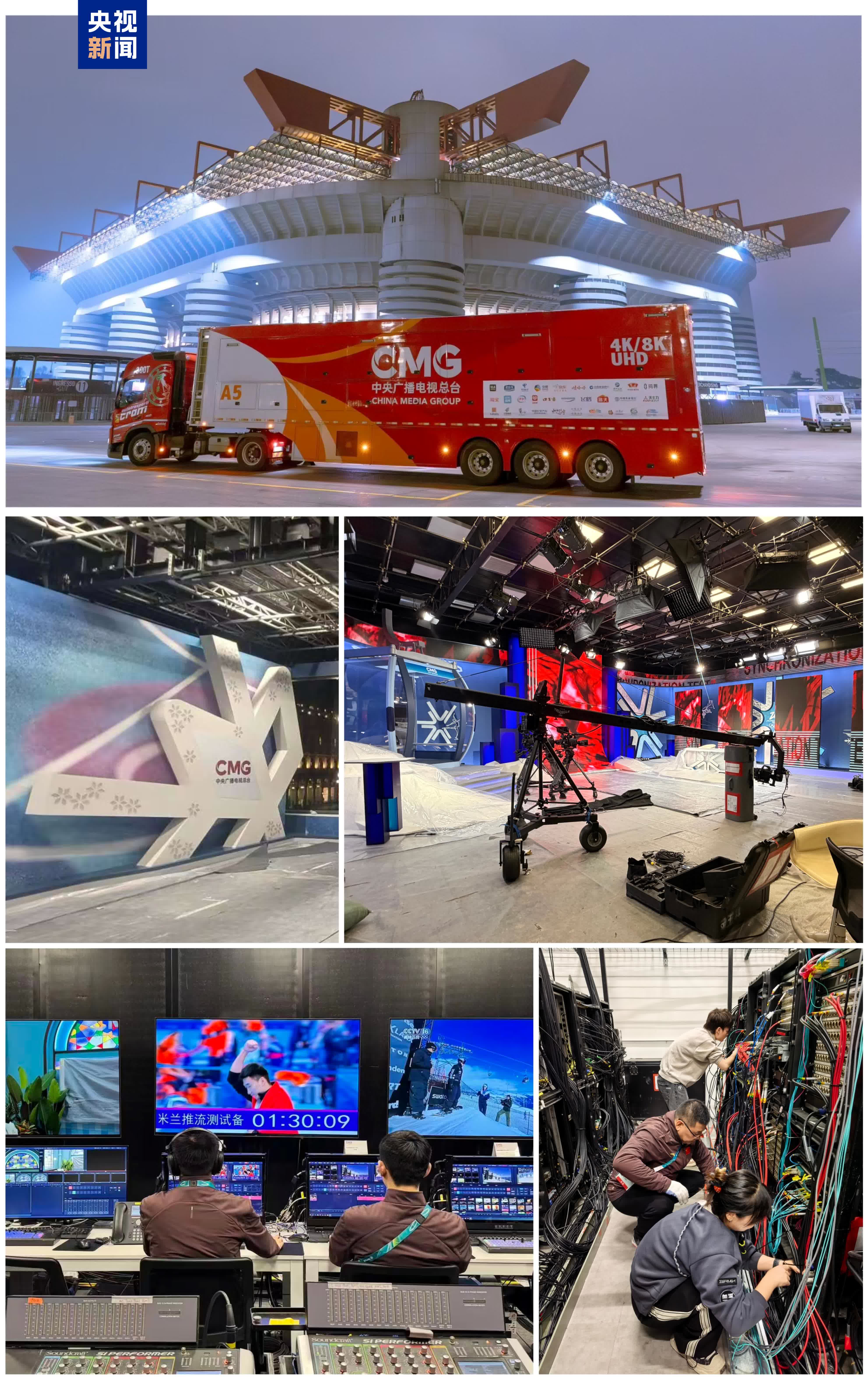 總台「中國紅」4K/8K超高清轉播車隊已於當地時間1月13日抵達意大利米蘭聖西羅體育場,完成進駐部署。目前,總台三個IBC前方演播室和米蘭外景演播室的舞美製景搭建和技術系統測試已基本完成,利維尼奧的雪山外景演播室建設接近尾聲,即將交付聯調演練。