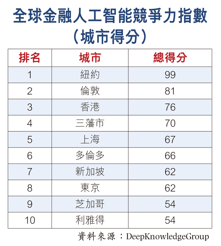 香港文匯報訊(記者 陳鍵行)國際投資分析機構Deep Knowledge Group(DKG)昨日發布《香港金融人工智能》報告,識別人工智能在香港金融業應用生態的多項關鍵特徵。同日發布的《全球人工智能競爭力指數(第五部分)》顯示,在全球金融人工智能競爭力指數城市得分排名中,香港以76分位列第三,紐約以99分位居第一,倫敦以81分排第二;在以國家排名中,美國以98.84分居首,中國以83.41分排第二。該兩份報告均由香港金融發展局擔任觀察員。