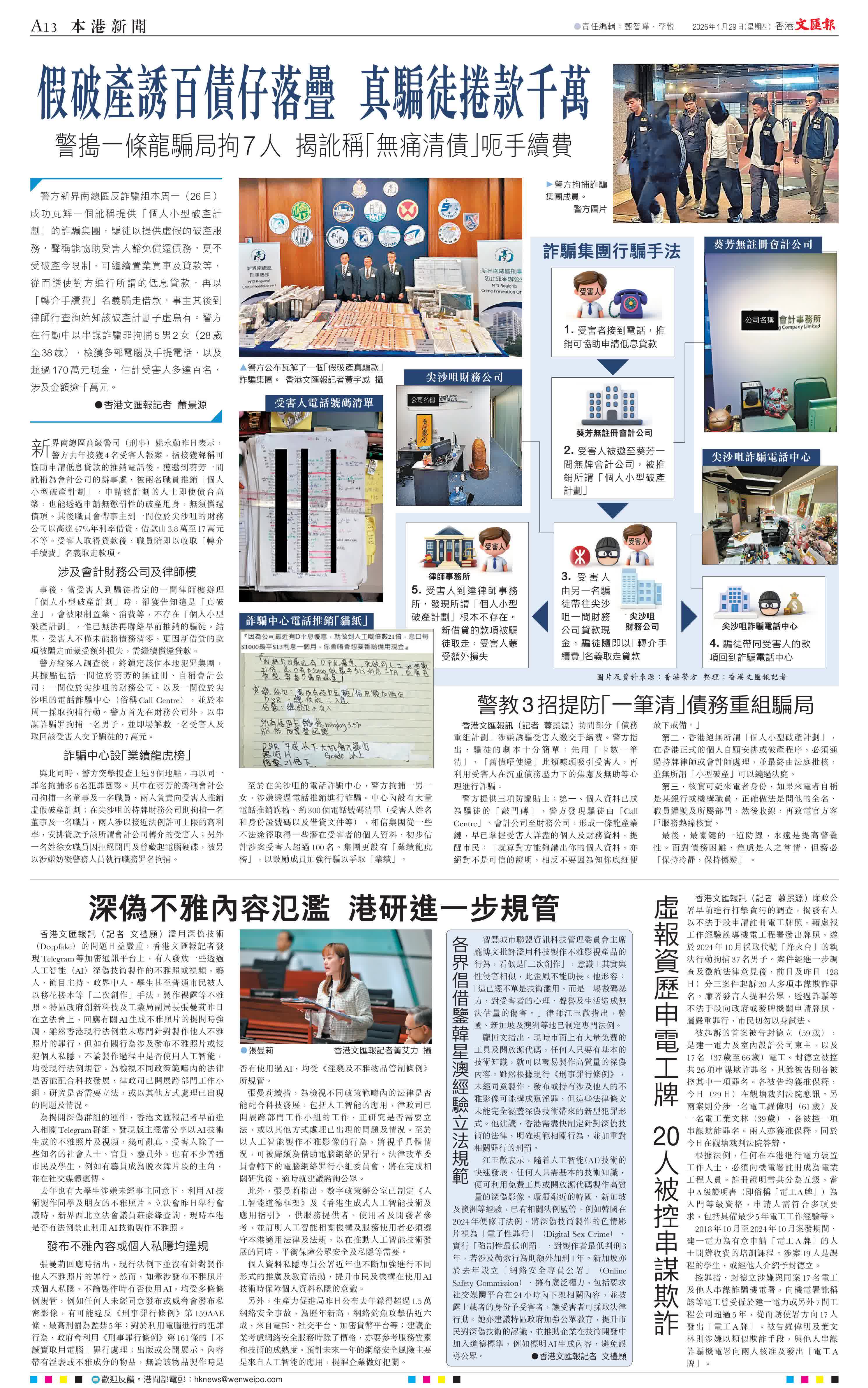 (香港文匯報記者 蕭景源)警方新界南總區反詐騙組本周一(26日)成功瓦解一個訛稱提供「個人小型破產計劃」的詐騙集團,騙徒以提供虛假的破產服務,聲稱能協助受害人豁免償還債務,更不受破產令限制,可繼續置業買車及貸款等,從而誘使對方進行所謂的低息貸款,再以「轉介手續費」名義騙走借款,事主其後到律師行查詢始知該破產計劃子虛烏有。警方在行動中以串謀詐騙罪拘捕5男2女(28歲至38歲),檢獲多部電腦及手提電話,以及超過170萬元現金,估計受害人多達百名,涉及金額逾千萬元。