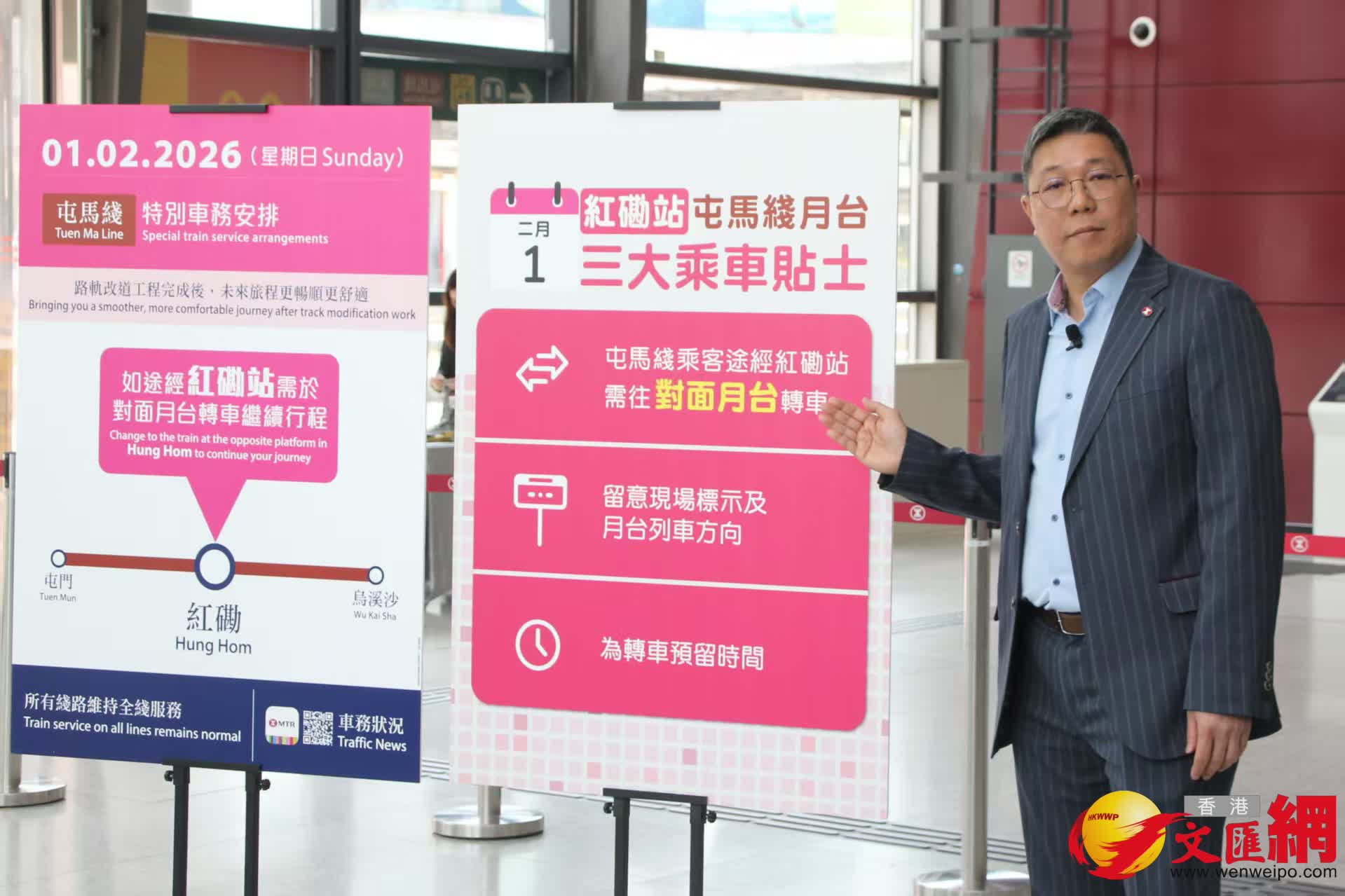 陳志雄又表示,為了維持客流暢順,讓乘客有序轉車,紅磡站屯馬綫兩邊月台的列車將輪流到站,乘客或需在月台稍等,建議預留多數分鐘轉車。