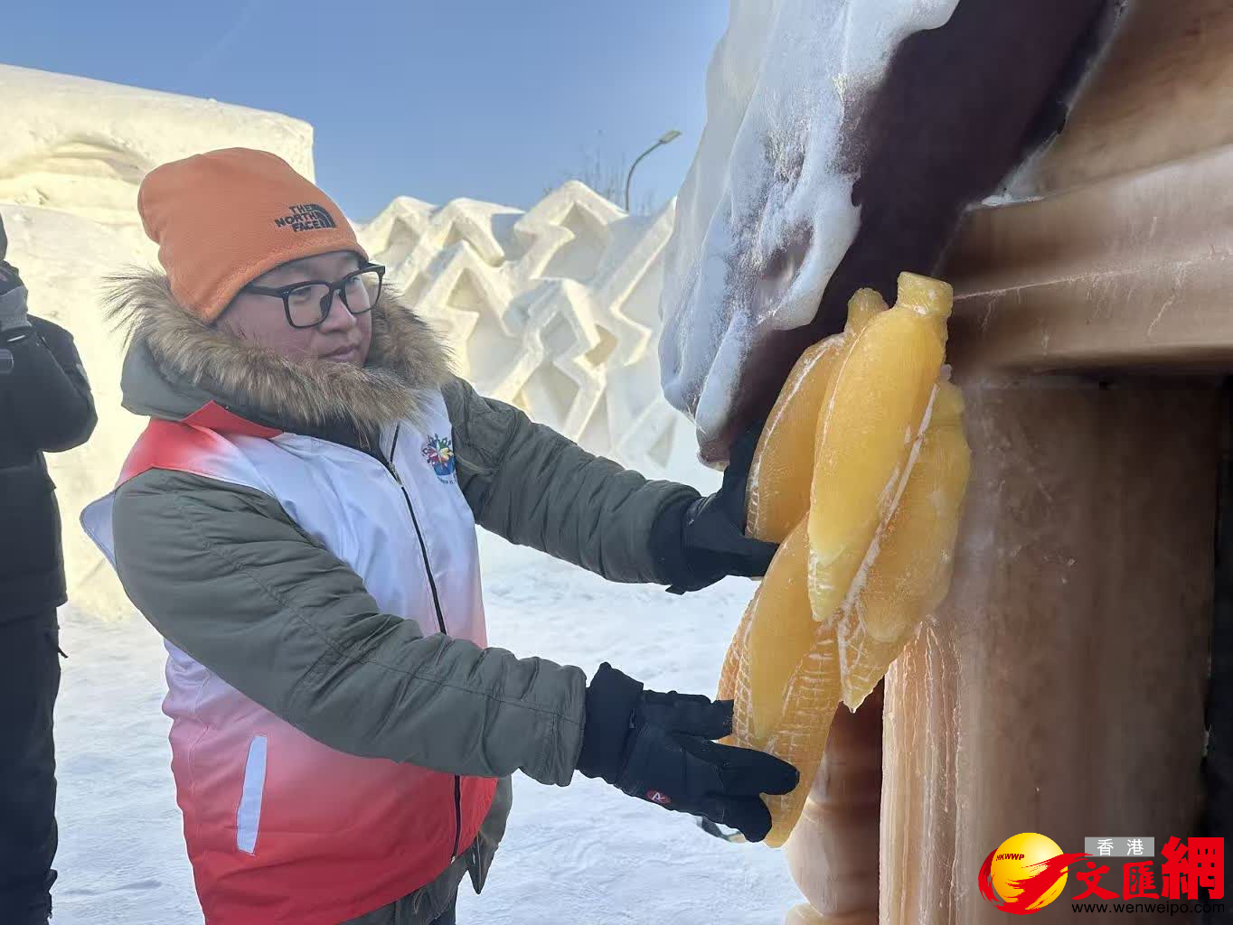 為了打造濃厚的東北文化氛圍,雕刻師們採用植物彩色冰現場雕刻出玉米、南瓜、辣椒等作品,玉米粒顆顆飽滿、南瓜色澤鮮艷逼真,遊客們捧在手裏體驗,愛不釋手。