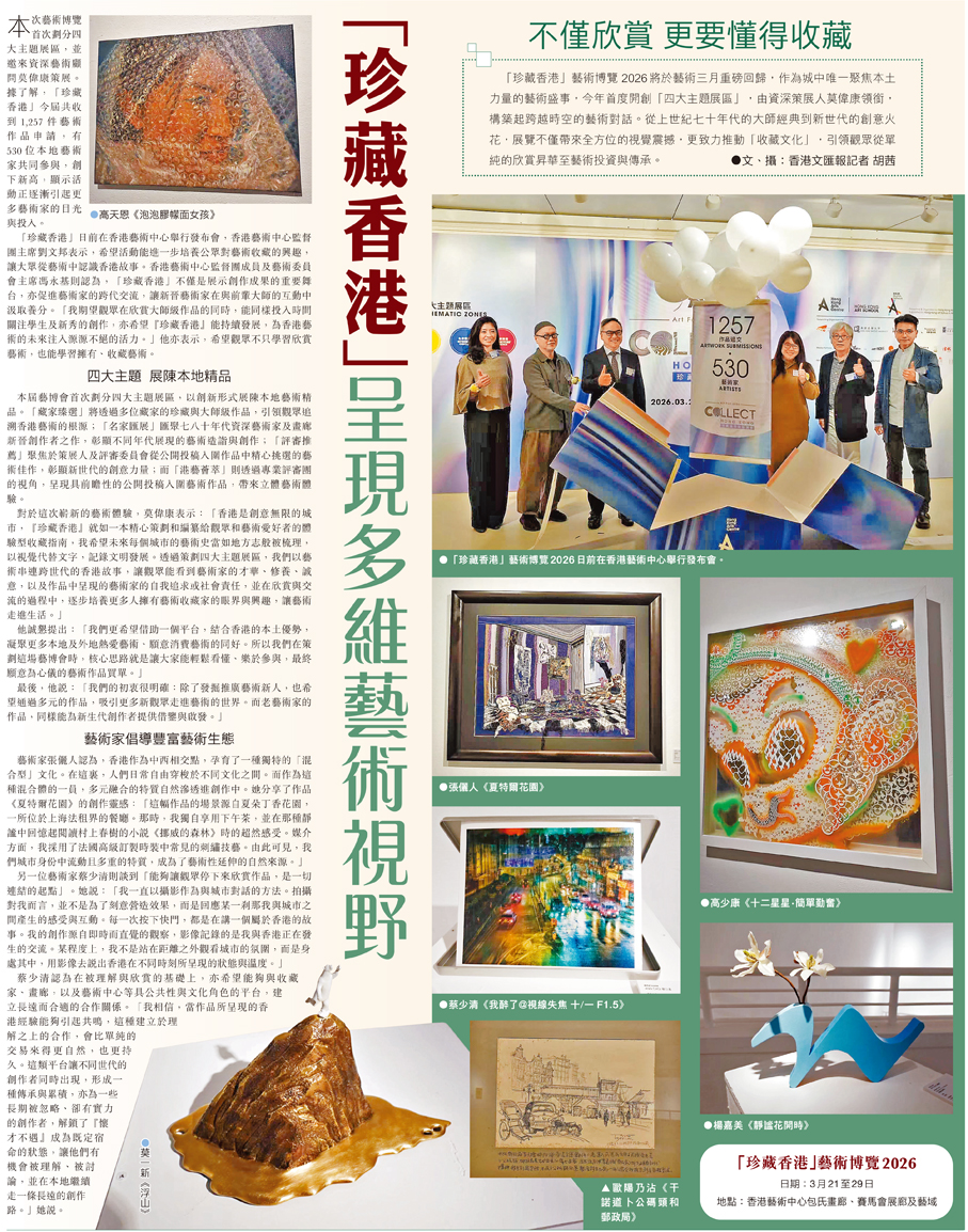「珍藏香港」日前在香港藝術中心舉行發布會,香港藝術中心監督團主席劉文邦表示,希望活動能進一步培養公眾對藝術收藏的興趣,讓大眾從藝術中認識香港故事。香港藝術中心監督團成員及藝術委員會主席馮永基則認為,「珍藏香港」不僅是展示創作成果的重要舞台,亦促進藝術家的跨代交流,讓新晉藝術家在與前輩大師的互動中汲取養分。「我期望觀眾在欣賞大師級作品的同時,能同樣投入時間關注學生及新秀的創作,亦希望『珍藏香港』能持續發展,為香港藝術的未來注入源源不絕的活力。」他亦表示,希望觀眾不只學習欣賞藝術,也能學習擁有、收藏藝術。
