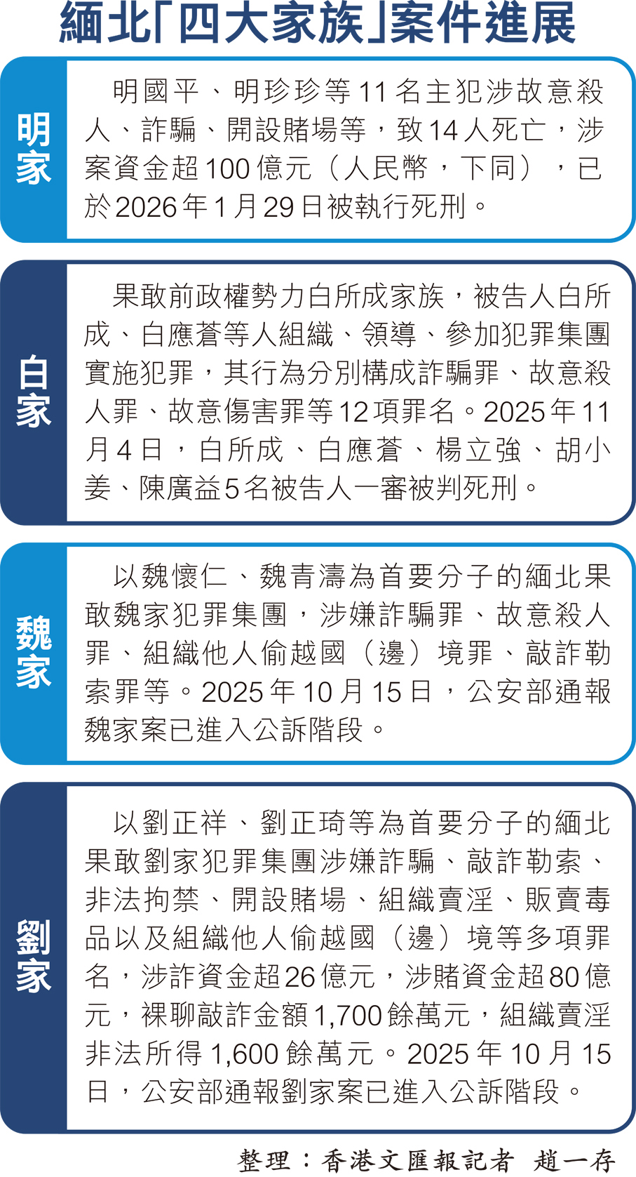 明家犯罪集團主犯長期盤踞緬北果敢地區,大肆實施故意殺人、故意傷害、非法拘禁、電信網絡詐騙、開設賭場等嚴重犯罪,造成14名中國公民死亡,涉詐涉賭資金逾百億元人民幣,社會危害極其嚴重。2025年2月溫州市中院對此案一審開庭審理,同年9月29日一審宣判上述11人獲死刑,之後部分被告人提出上訴。至11月25日二審駁回上訴,維持原判,並依法報請最高法核准。隨後,最高法核准死刑判決,溫州中院依法執行。