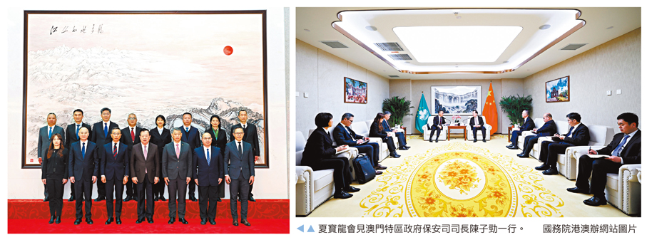 香港文匯報訊 據中共中央港澳工作辦公室、國務院港澳事務辦公室網訊,1月29日下午,中央港澳工作辦公室主任、國務院港澳事務辦公室主任夏寶龍在北京會見澳門特區政府保安司司長陳子勁一行。