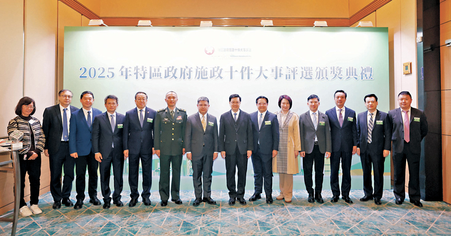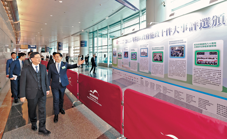由香港文匯報發起,大公報、點新聞等30家媒體聯合主辦,54間團體協辦的「2025年特區政府施政十件大事評選」昨日舉行頒獎典禮,「立法會選舉成功舉行 優質民主開創新局」獲得最多市民關注,其次為「宏福苑發生五級大火 齊心協力救災善後」。香港特區行政長官李家超在典禮上致辭時表示,回首2025年,香港在邁向由治及興的新征程上穩步前行。這一年,我們共同見證很多對香港未來發展具有深遠意義的事件,每一件都勾勒了我們的奮鬥足跡。新的一年,政府會鞏固完善行政主導,團結所有愛國愛港的力量,推動香港繼續積極融入和服務國家發展大局,主動對接「十五五」規劃等國家戰略,同時推行系統性改革,決心打破利益藩籬,讓香港這個共同家園變得更美好。