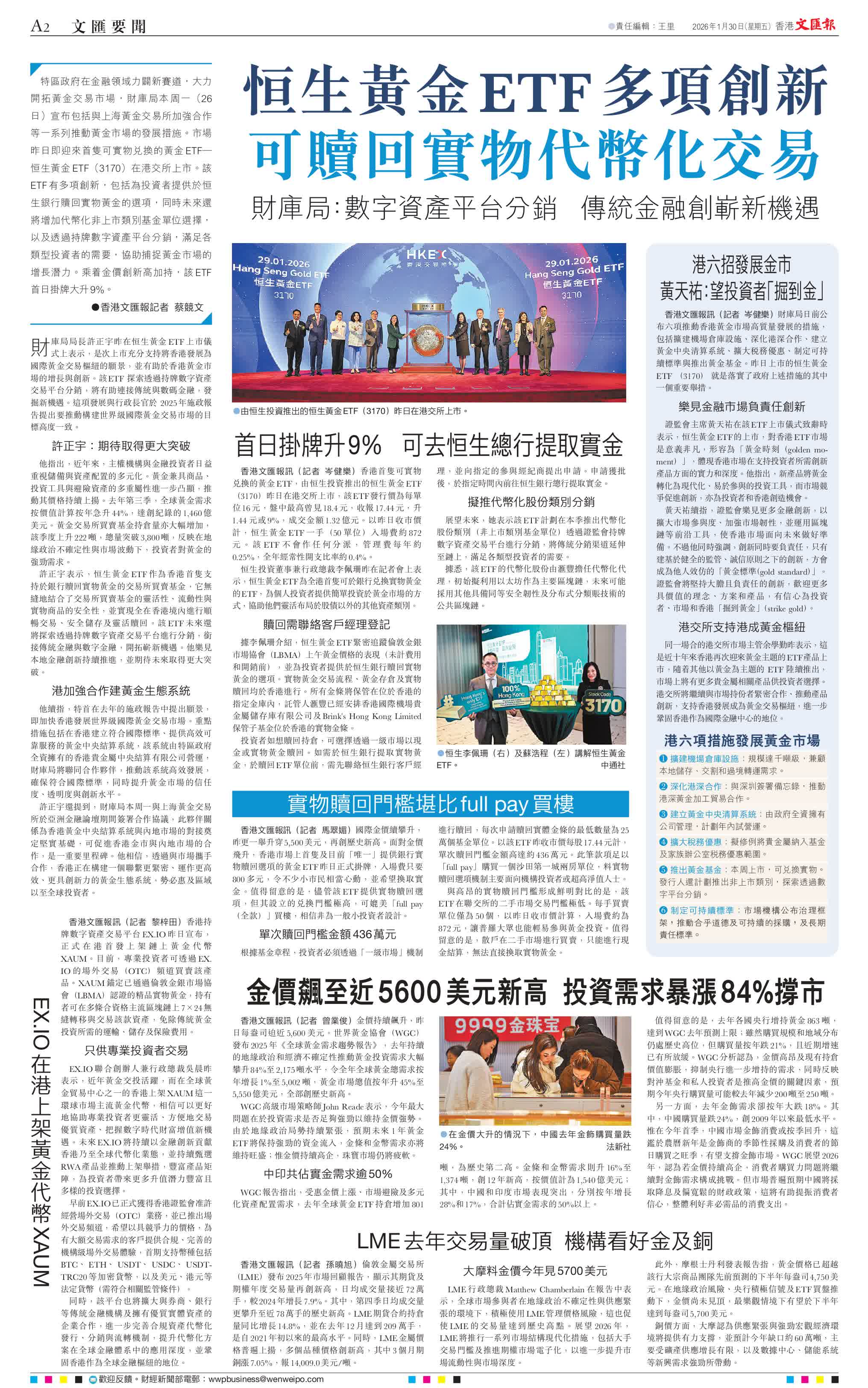 香港文匯報訊(記者 蔡競文)特區政府在金融領域力闢新賽道,大力開拓黃金交易市場,財庫局本周一(26日)宣布包括與上海黃金交易所加強合作等一系列推動黃金市場的發展措施。市場昨日即迎來首隻可實物兌換的黃金ETF—恒生黃金ETF(3170)在港交所上市。該ETF有多項創新,包括為投資者提供於恒生銀行贖回實物黃金的選項,同時未來還將增加代幣化非上市類別基金單位選擇,以及透過持牌數字資產平台分銷,滿足各類型投資者的需要,協助捕捉黃金市場的增長潛力。乘着金價創新高加持,該ETF首日掛牌大升9%。