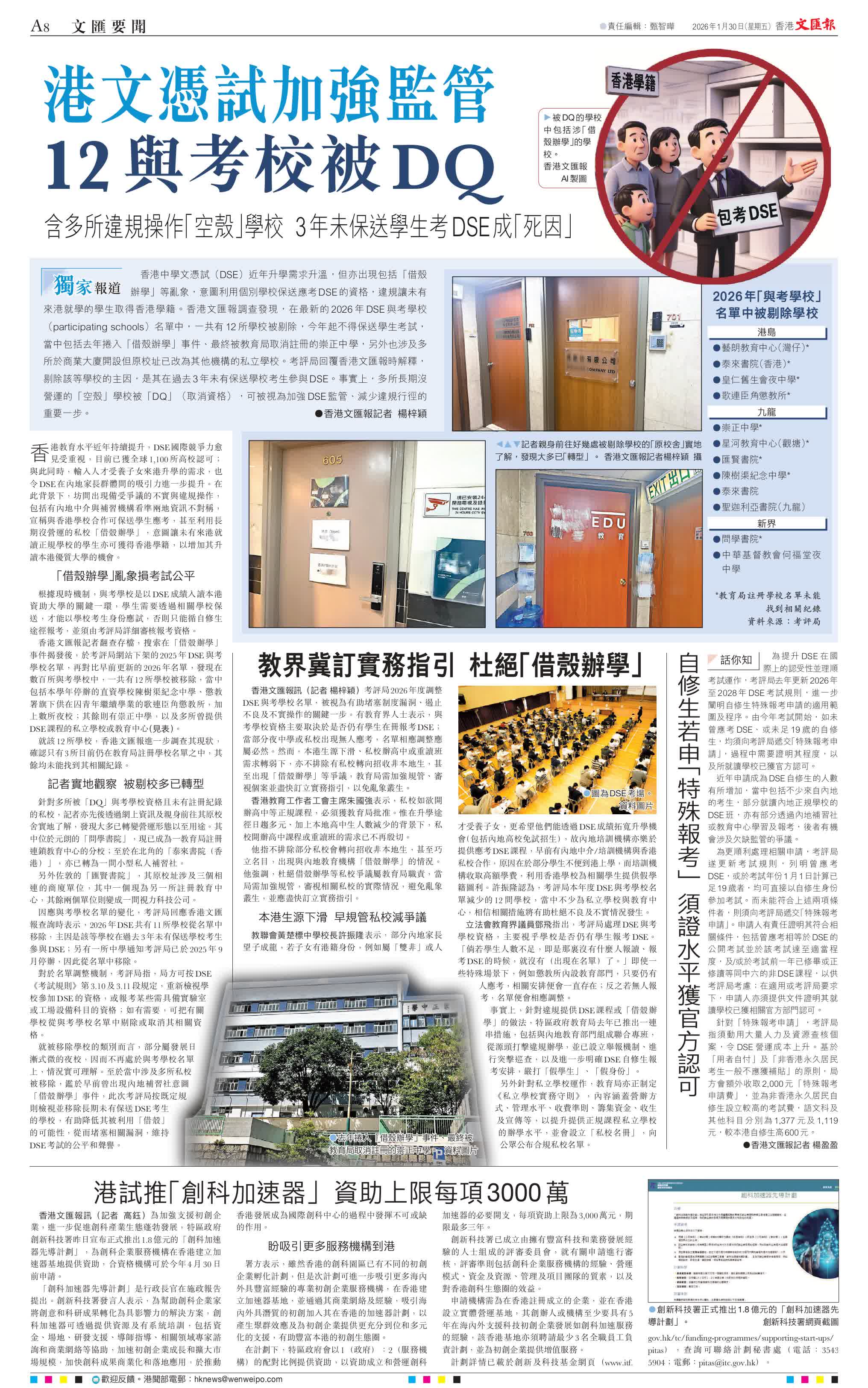 香港文匯報訊(記者 楊梓穎)香港中學文憑試(DSE)近年升學需求升溫,但亦出現包括「借殼辦學」等亂象,意圖利用個別學校保送應考DSE的資格,違規讓未有來港就學的學生取得香港學籍。香港文匯報調查發現,在最新的2026年DSE與考學校(participating schools)名單中,一共有12所學校被剔除,今年起不得保送學生考試,當中包括去年捲入「借殼辦學」事件、最終被教育局取消註冊的崇正中學,另外也涉及多所於商業大廈開設但原校址已改為其他機構的私立學校。考評局回覆香港文匯報時解釋,剔除該等學校的主因,是其在過去3年未有保送學校考生參與DSE。事實上,多所長期沒營運的「空殼」學校被「DQ」(取消資格),可被視為加強DSE監管、減少違規行徑的重要一步。