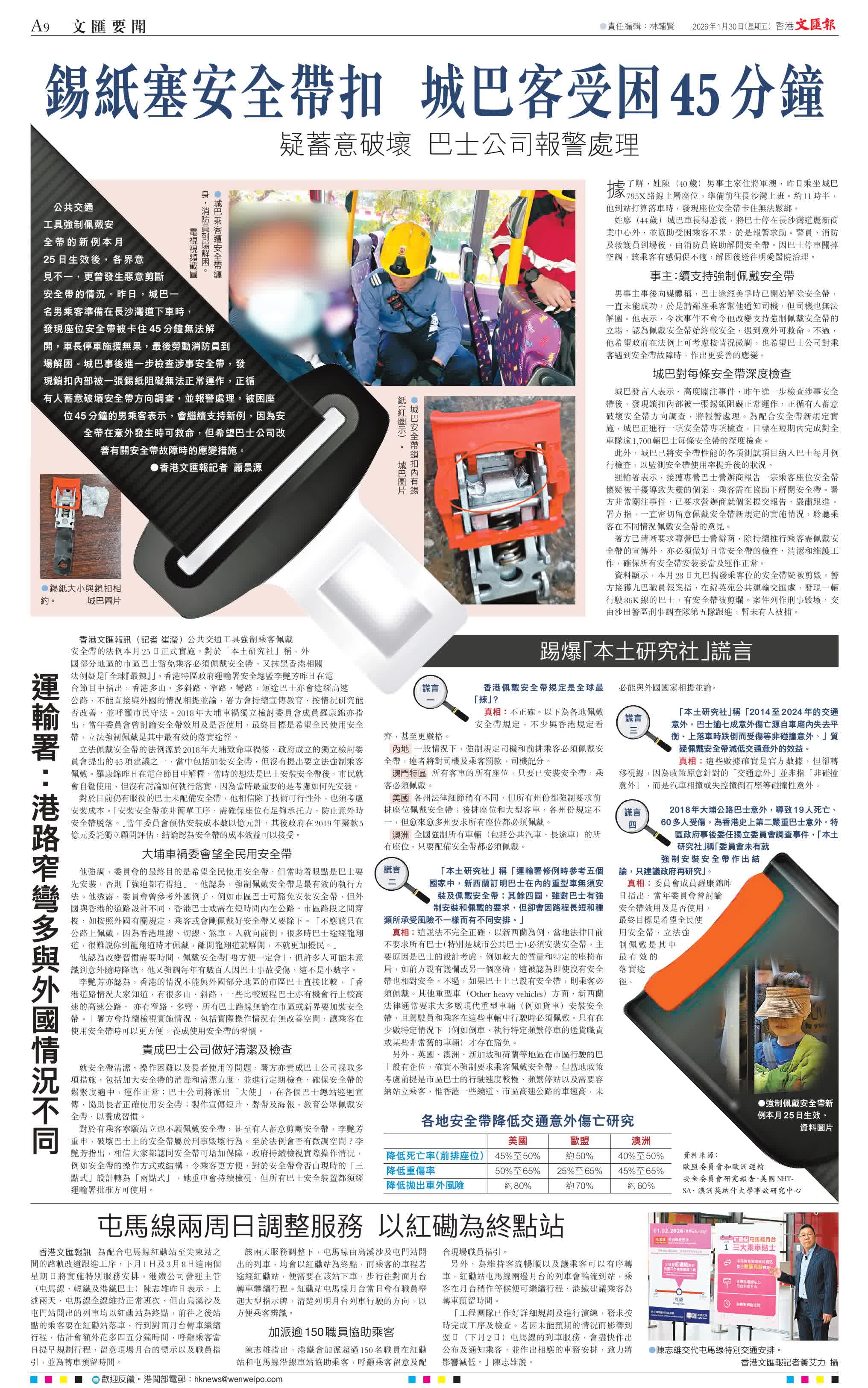 另外,英國、澳洲、新加坡和荷蘭等地區在市區行駛的巴士設有企位,確實不強制要求乘客佩戴安全帶,但當地政策考慮前提是市區巴士的行駛速度較慢、頻繁停站以及需要容納站立乘客,惟香港一些繞道、市區高速公路的車速高,未必能與外國國家相提並論。