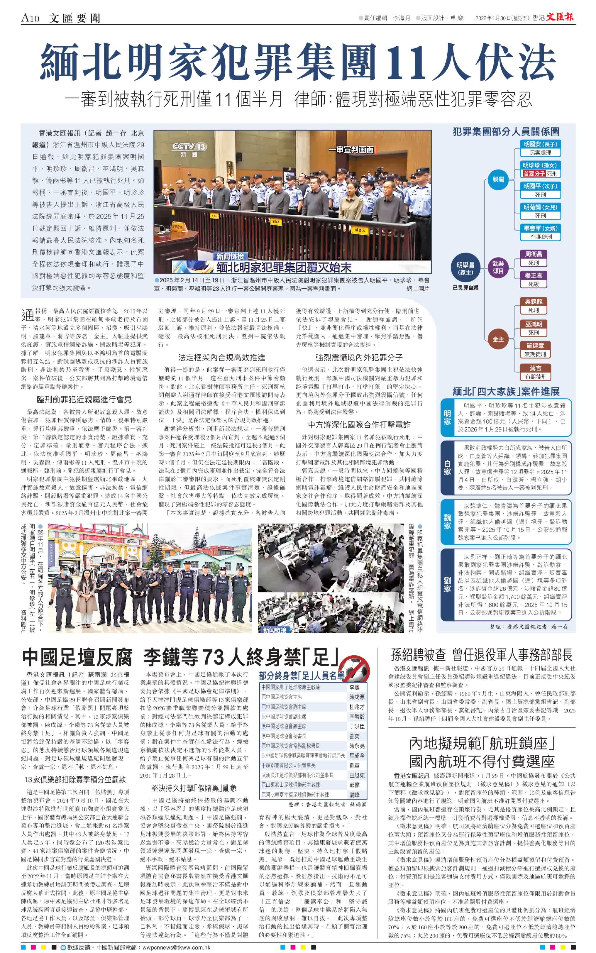 香港文匯報訊(記者 趙一存 北京報道)浙江省溫州市中級人民法院29日通報,緬北明家犯罪集團案明國平、明珍珍、周衛昌、巫鴻明、吳森龍、傅雨彬等11人已被執行死刑。通報稱,一審宣判後,明國平、明珍珍等被告人提出上訴,浙江省高級人民法院經開庭審理,於2025年11月25日裁定駁回上訴,維持原判,並依法報請最高人民法院核准。內地知名死刑覆核律師向香港文匯報表示,此案全程依法依規審理和執行,體現了中國對極端惡性犯罪的零容忍態度和堅決打擊的強大震懾。