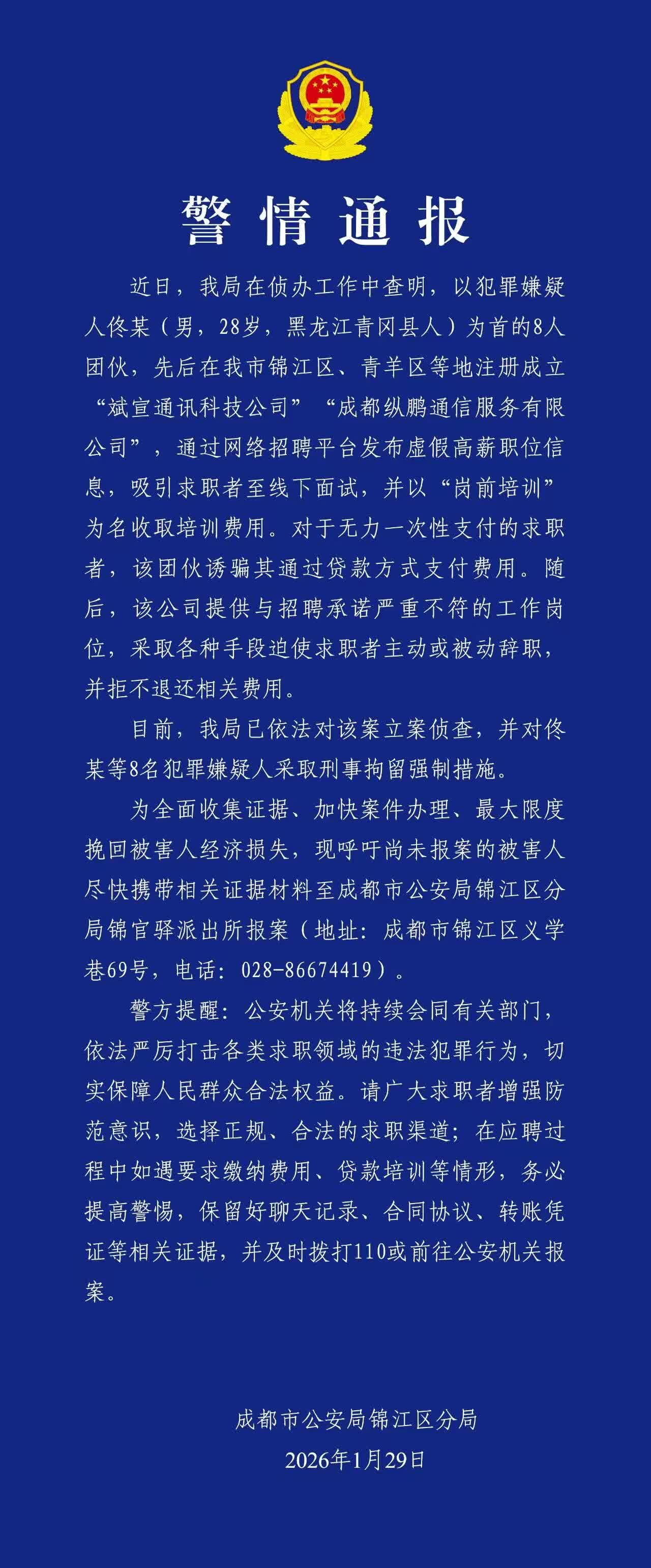 據「成都錦江公安」微信公眾號消息,近日,成都市公安局錦江區分局在偵辦工作中查明,以犯罪嫌疑人佟某(男,28歲,黑龍江青岡縣人)為首的8人團夥,先後在成都市錦江區、青羊區等地註冊成立「斌宣通訊科技公司」「成都縱鵬通信服務有限公司」,通過網絡招聘平台發布虛假高薪職位信息,吸引求職者至線下面試,並以「崗前培訓」為名收取培訓費用。對於無力一次性支付的求職者,該團夥誘騙其通過貸款方式支付費用。隨後,該公司提供與招聘承諾嚴重不符的工作崗位,採取各種手段迫使求職者主動或被動辭職,並拒不退還相關費用。