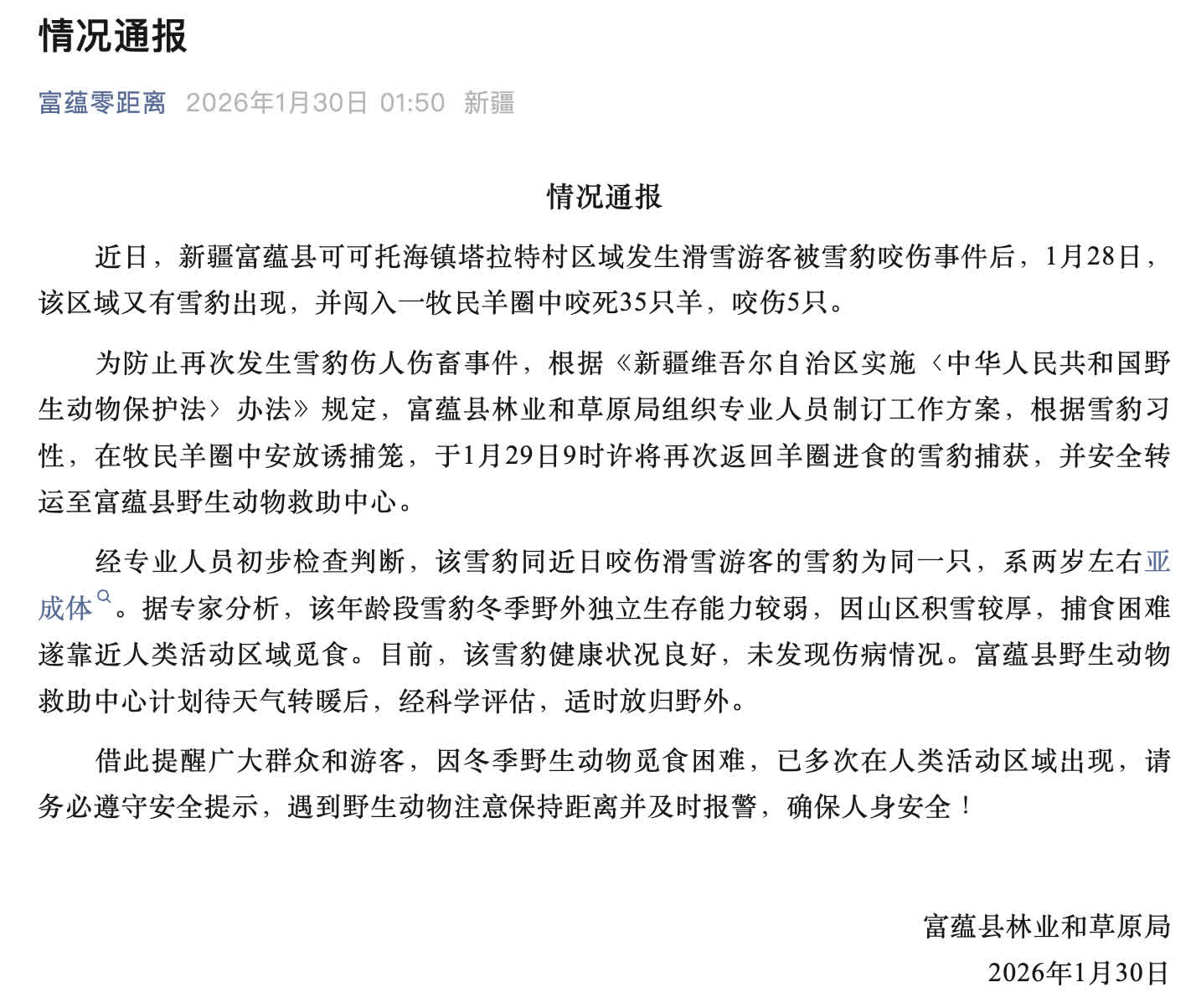 1月23日晚,新疆阿勒泰可可托海鎮塔拉特村區域發生一起野生動物雪豹傷人事件。一名滑雪遊客返回賓館途中,在路邊林帶被雪豹咬傷,報警後立即被送往富蘊縣人民醫院進行救治。