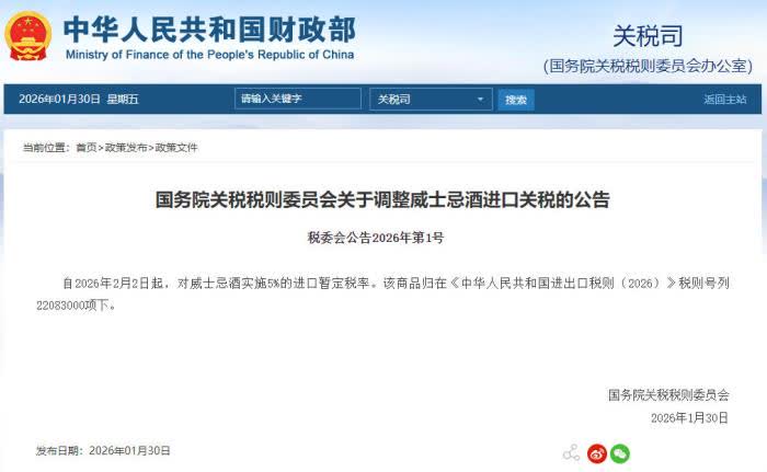 國務院關稅稅則委員會30日發布《國務院關稅稅則委員會關於調整威士忌酒進口關稅的公告》稱,自2026年2月2日起,對威士忌酒實施5%的進口暫定稅率。該商品歸在《中華人民共和國進出口稅則(2026)》稅則號列22083000項下。