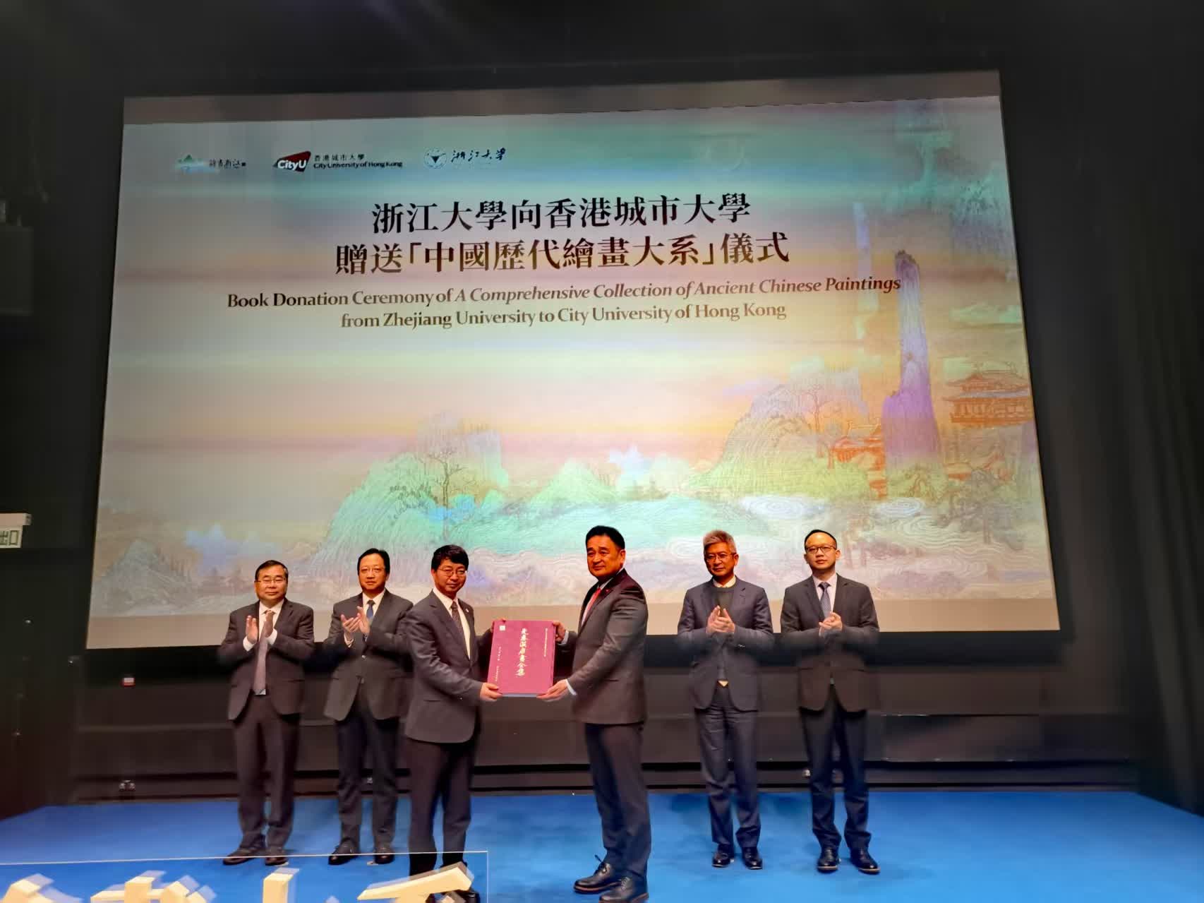 致辭結束之後,浙江大學向香港城市大學贈送了「中國歷代繪畫大系」《先秦漢唐畫全集》第一卷,為兩地文化交流留下珍貴印記。