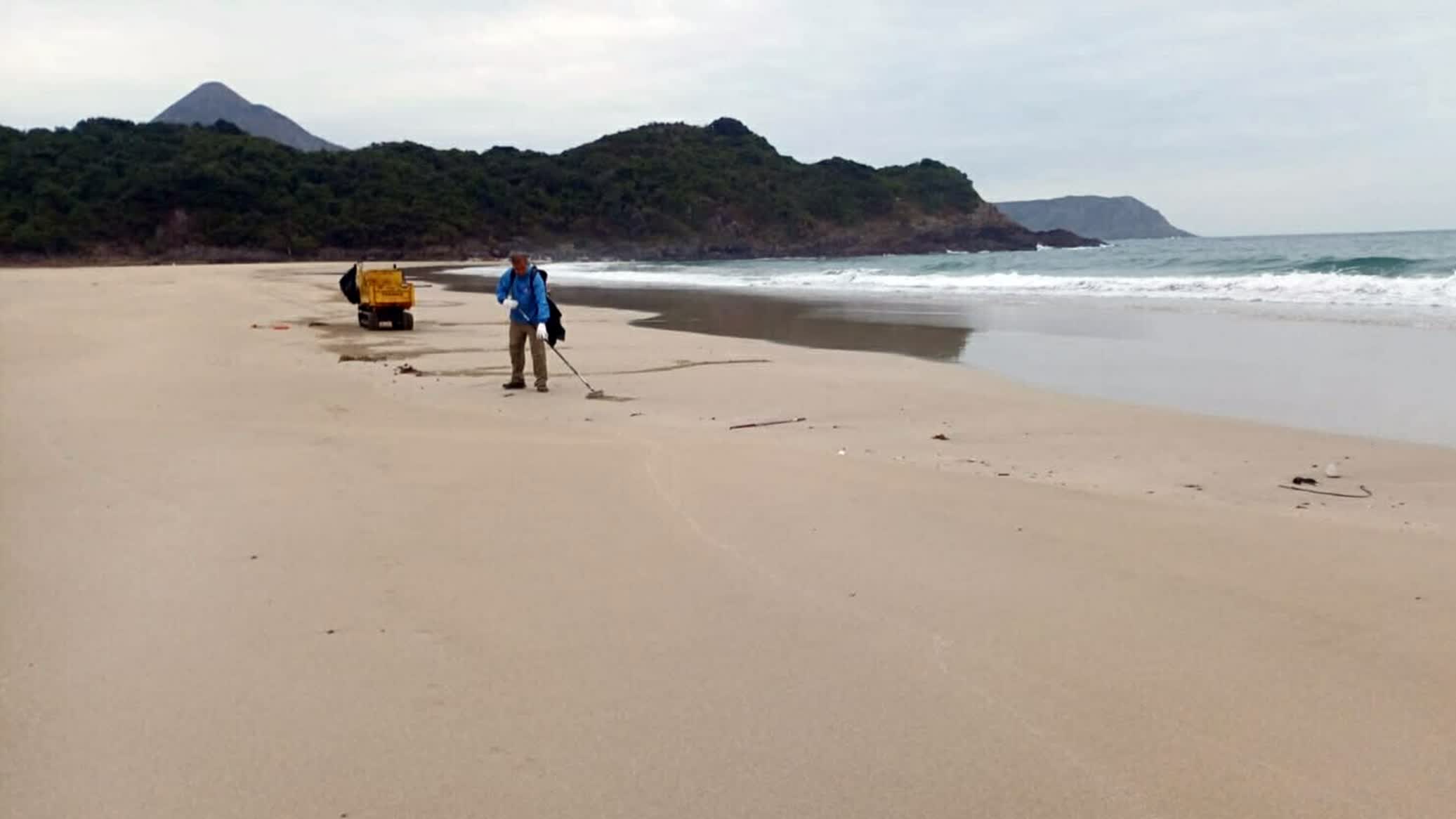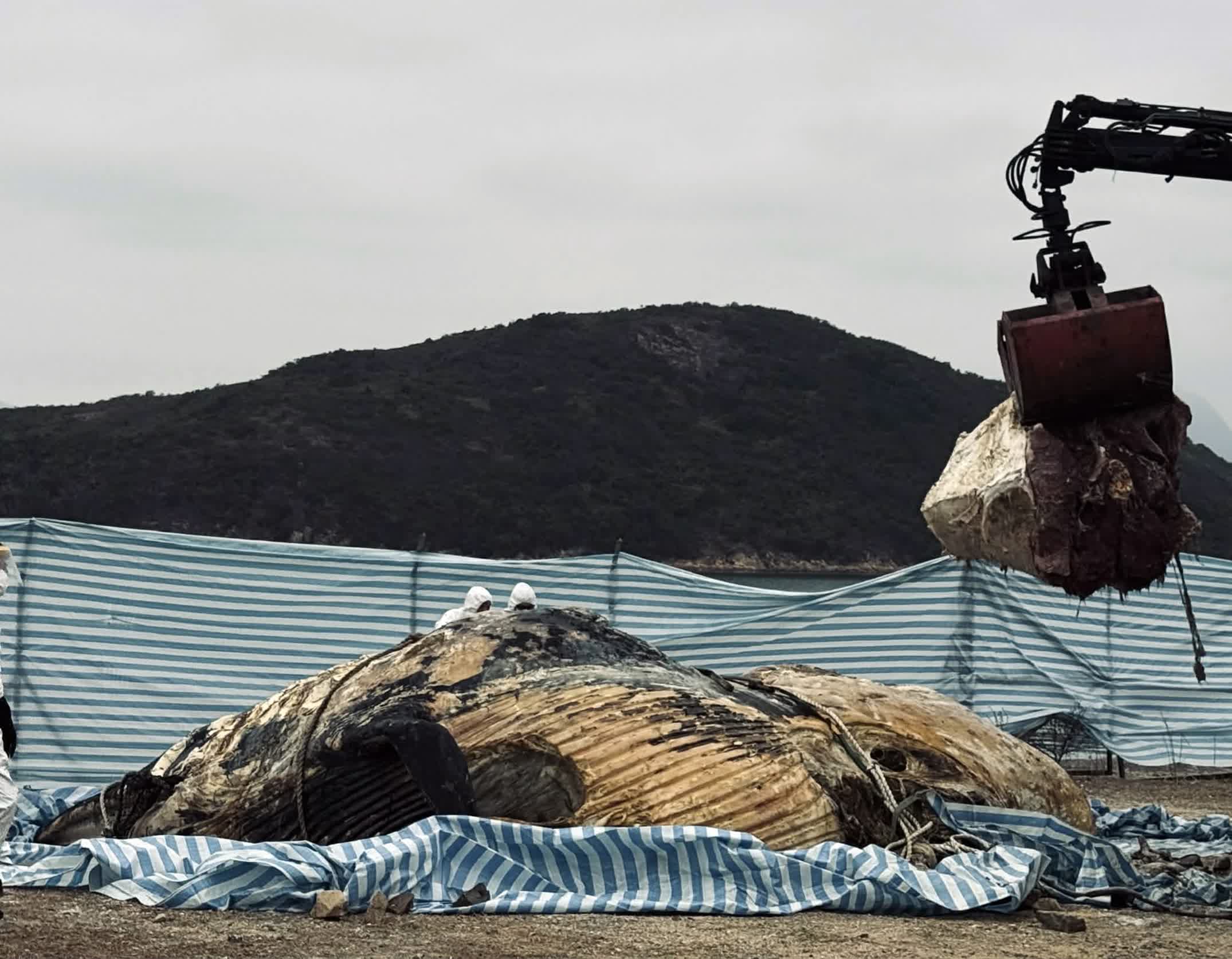 香港文匯報訊(記者 蕭景源)西貢鹹田灣昨日(29日)驚現由海浪沖上岸的腐爛鯨屍。漁農自然護理署(漁護署)今日(30日)表示,已完成鯨屍棄置及鹹田灣的清理工作。由署方上載到社交平台的圖片可見,有穿戴防護服的工作人員在萬宜水庫西壩出動重型機械處理鯨屍,亦有人員在鹹田灣沙灘進行清理。