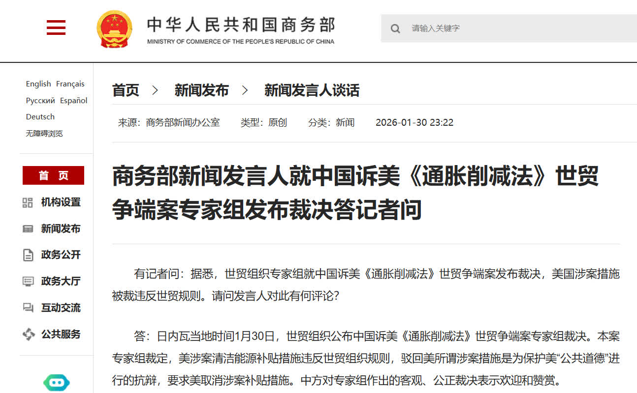 據商務部網站消息,商務部新聞發言人就中國訴美《通脹削減法》世貿爭端案專家組發布裁決答記者問。