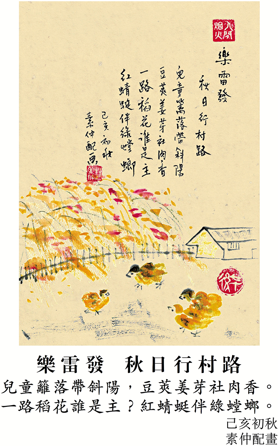 詩人吸引我的是詩題《秋日行村路》。60年前南丫島是怎樣的?就有詩題的味道,恍如秋日行走在村郊路上。那年代的南丫島很僻靜,前往也不方便,要到香港仔乘搭漁船前往。60年前的初秋,跟隨父親一行七人到了南丫島,走在路上,滿目青翠,菜田長得茂盛。我們在村邊的一間小型家庭式士多食午餐,店主夫婦二人盛意招呼。當我們看到一隻雞剛下了蛋,大家很興奮,想着這麼新鮮的雞蛋一定很香,但七個人只得一隻蛋,如何夠吃?女店主想到,將雞蛋打進剛煮好的熱飯,再加入生抽、熟油撈勻,然後每人分得兩湯匙雞蛋撈飯。嘩,真是香得很!自從禽流感之後,人們再也不敢走近雞隻,連雞毛掃也不敢用,生雞蛋更不敢吃。飯後,店主問我們要不要買地,一塊錢一呎,那時候想也不敢想。現在回想,當時其實應該想一想,不過,錢呢?「一路稻花誰是主?」我們在南丫島看到的是「一路菜花誰是主?」對了,蔬果雞蛋都是新鮮好吃,現在有冰箱,我們反而不能常吃新鮮的蔬果了。